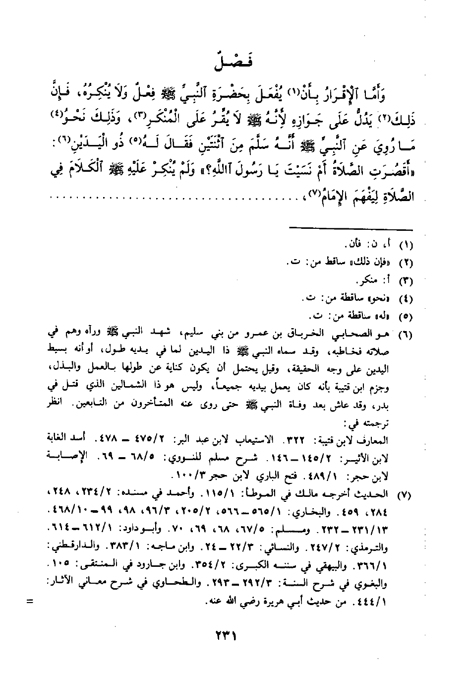 (٦) هو الصحابي الخرباق بن عمرو من بني سليم، شهد النبي - صلى الله عليه وسلم - ورآه وهم في صلاته فخاطبه، وقد سماه النبي - صلى الله عليه وسلم - ذا اليدين لما في يديه طول، أو أنه بسيط اليدين على وجه الحقيقة، وقيل يحتمل أن يكون كناية عن طولها بالعمل والبذل، وجزم ابن قتيبة بأنه كان يعمل بيديه جميعاَّ، وليس هو ذا الشماليين الذي قتل في بدر، وقد عاش بعد وفاة النبي - صلى الله عليه وسلم - حتى روى عنه المتأخرون من التابعين. انظر ترجمته في: