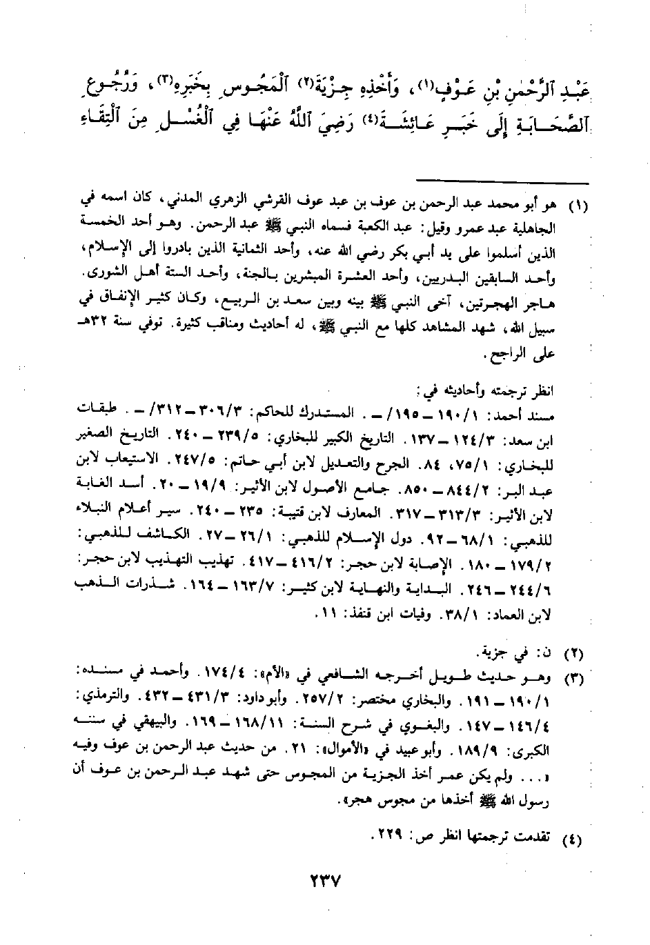 (٣) وهو حديث طويل أخرجه الشافعي في (الأم): ٤/ ١٧٤. وأحمد في مسنده: ١/ ١٩٠ - ١٩١. والبخاري مختصر: ٢/ ٢٥٧. وأبو داود: ٣/ ٤٣١ - ٤٣٢. والترمذي: ٤/ ١٤٦ - ١٤٧. والبغوي في شرح السنة: ١/ ١٦٨١ - ١٦٩. والبيهقي في سننه الكبرى: ٩/ ١٨٩. وأبو عبيد في (الأموال): ٢١. من حديث عبد الرحمن بن عوف وفيه ( ... ولم يكن عمر أخذ الجزية من المجوس حتى شهد عبد الرحمن بن عوف أن رسول الله - صلى الله عليه وسلم - أخذها من مجوس هجر).