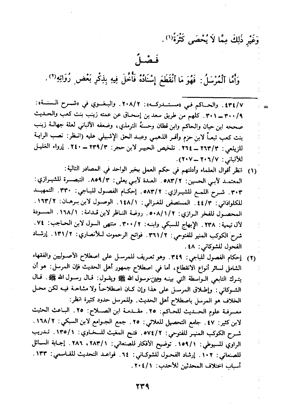 (٢) إحكام الفصول للباجي: ٣٤٩. وهو تعريف للمرسل على اصطلاح الأصوليين والفقهاء الشامل لسائر أنواع الانقطاع، أما في اصطلاح جمهور أهل الحديث فإن المرسل: هو أن يترك التابعي الواسطة التي بينه وبين رسول الله - صلى الله عليه وسلم - ويقول: قال رسول الله - صلى الله عليه وسلم -. قال الشوكاني: وإطلاق المرسل على هذا وإن كان اصطلاحًا ولا مشاحهَ فيه لكن محل الخلاف هو المرسل باصطلاح أهل الحديث. وللمرسل حدود كثيرة انظر: