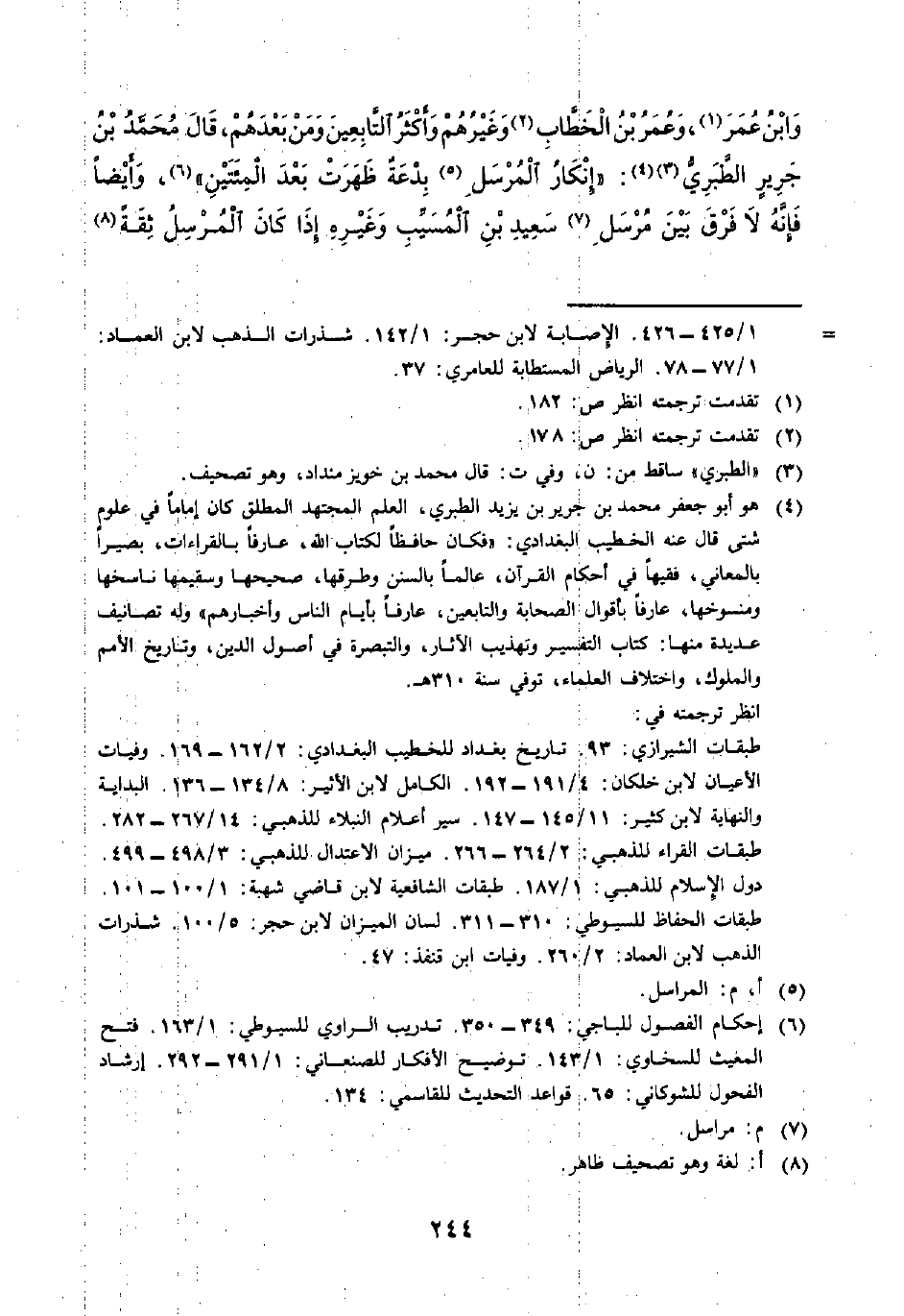 وَابْنُ عُمَرَ (١)، وَعُمَرُ بْنُ الْخَطَّابِ (٢) وَغَيْرُهُمْ وَأَكْثَرُ التَّابِعِينَ وَمَنْ بَعْدَهُمْ، قَالَ مُحَمَّدُ بْنُ جَرِيرٍ الطَّبَرِيُّ (٣) (٤): (إِنْكَارُ الْمُرْسَلِ (٥) بِدْعَةٌ ظَهَرَتْ بَعْدَ الْمِئَتَيْنِ) (٦)، وَأَيْضًا فَإِنَّهُ لَا فَرْقَ بَيْنَ مُرْسَلِ (٧) سَعِيدِ بْنِ الْمُسَيِّبِ وَغَيْرِهِ إِذَا كَانَ الْمُرْسِلُ ثِقَةً (٨)