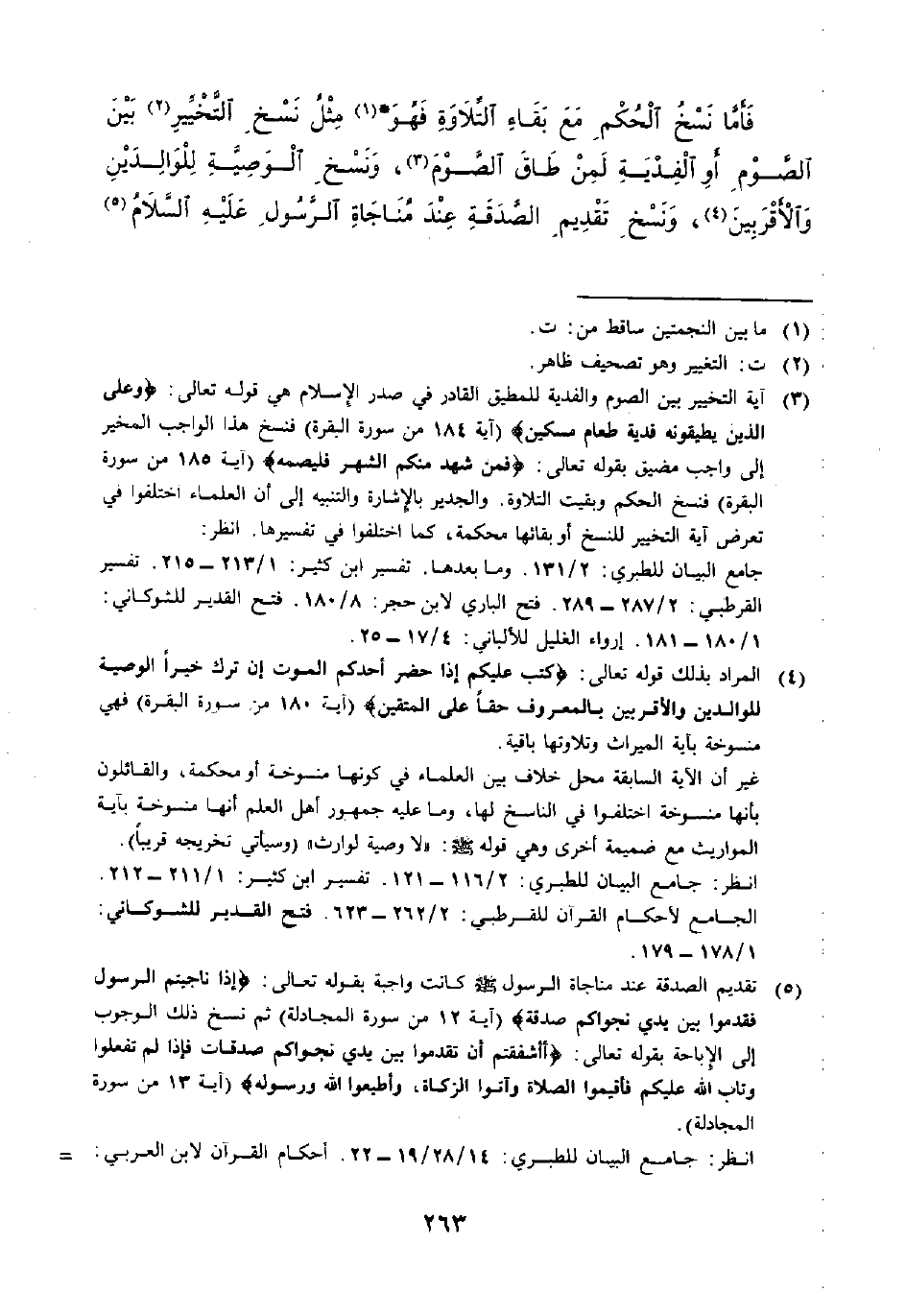 فَأَمَّا نَسْخُ الْحُكْمِ مَعَ بَقَاءِ التِّلَاوَةِ فَهُوَ * (١) مِثْلُ نَسْخِ حُكْمِ التَّخْيِيرِ (٢) بَيْنَ الصَّوْمِ أَوِ الْفِدْيَةِ لِمَنْ طَاقَ الصَّوْمَ (٣)، وَنَسْخِ الْوَصِيَّةِ لِلْوَالِدَيْنِ وَالْأَقْرَبِينَ (٤)، وَنَسْخِ تَقْدِيمِ الصَّدَقَةِ عِنْدَ مُنَاجَاةِ الرَّسُولِ عَلَيْهِ السَّلَامُ (٥)،