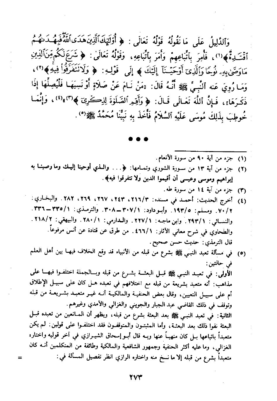 وَالدَّلِيلُ عَلَى مَا نَقُولُهُ قَوْلُهُ تَعَالَى: {أُولَئِكَ الَّذِينَ هَدَى اللَّهُ فَبِهُدَاهُمُ اقْتَدِهْ} (١)، فَأُمِرَ بِاتِّبَاعِهِمْ وَأَمَرَ بِاتِّبَاعِهِ، وَقَوْلُهُ تَعَالَى: {شَرَعَ لَكُمْ مِنَ الدِّينِ مَا وَصَّى بِهِ نُوحًا وَالَّذِي أَوْحَيْنَا إِلَيْكَ}، إِلَى قَوْلِهِ: {وَلَا تَتَفَرَّقُوا فيهِ} (٢)، وَمَا رُوِيَ عَنِ النَّبِيِّ - صَلَّى اللَّهُ عَلَيْهِ وَسَلَّمَ - أَنَّهُ قَالَ: (مَنْ نَامَ عَنْ صَلَاةٍ أَوْ نَسِيَهَا فَلْيُصَلِّهَا إِذَا ذَكَرَهَا)، فَإِنَّ اللَّهَ تَعَالَى قَالَ: {وَأَقِمِ الصَّلَاةَ لِذِكْرِي} (٣)) (٤)، وَإِنَّمَا خُوطِبَ بِذَلِكَ مُوسَى عَلَيْهِ السَّلَامُ فَأَخَذَ بِهِ نَبِيُّنَا مُحَمَّدٌ - صَلَّى اللَّهُ عَلَيْهِ وَسَلَّمَ - (٥).