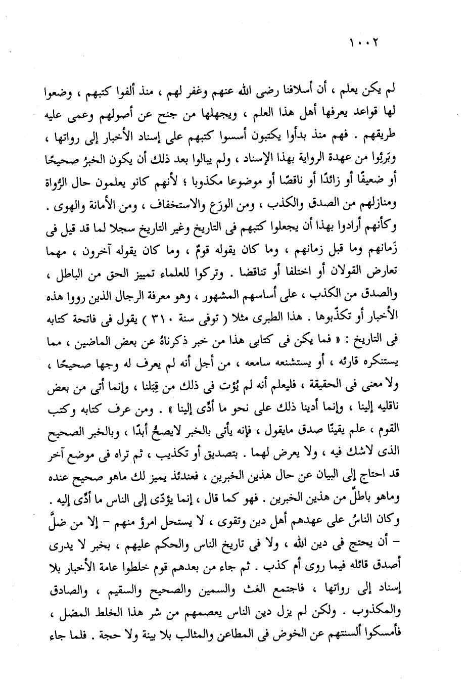 لم يكن يعلم، أن أسلافنا -رضي الله عنهم- وغفر لهم، منذ ألفوا كتبهم، وضعوا لها قواعد يعرفها أهل هذا العلم، ويجهلها من جنح عن أصولهم وعمى عليه طريقهم. فهم منذ بدأوا يكتبون أسسوا كتبهم على إسناد الأخبار إلى رواتها، وبَرئِوا من عهدة الرواية بهذا الإسناد، ولم يبالوا بعد ذلك أن يكون الخبرُ صحيحًا أو ضعيفًا أو زائدًا أو ناقصًا أو موضوعا مكذوبا؛ لأنهم كانو يعلمون حال الرُّواة ومنازلهم من الصدق والكذب، ومن الورَع والاستخفاف، ومن الأمانة والهوى. وكأنهم أرادوا بهذا أن يجعلوا كتبهم في التاريخ وغير التاريخ سجلا لما قد قيل في زَمانهم وما قبل زمانهم، وما كان يقوله قومٌ، وما كان يقوله آخرون، مهما تعارض القولان أو اختلفا أو تناقضا. وتركوا للعلماء تمييز الحق من الباطل، والصدق من الكذب، على أساسهم المشهور، وهو معرفة الرجال الذين رووا هذه الأخبار أو تكذّبوها. هذا الطبري مثلا (توفي سنة 310) يقول في فاتحة كتابه في التاريخ: "فما يكن في كتابى هذا من خبر ذكرناهُ عن بعض الماضين، مما يستنكره قارئه، أو يستشنعه سامعه، من أجل أنه لم يعرف له وجها صحيحًا، ولا معنى في الحقيقة، فليعلم أنه لم يُؤت في ذلك من قِبَلنا، وإنما أتى من بعض ناقليه إلينا، وإنما أدينا ذلك على نحو ما أدَّى إلينا". ومن عرف كتابه وكتب القوم، علم يقينًا صدق ما يقول، فإنه يأتي بالخبر لا يصحُّ أبدًا، وبالخبر الصحيح الذي لا شك فيه، ولا يعرض لهما. بتصديق أو تكذيب، ثم تراه في موضع آخر قد احتاج إلى البيان عن حال هذين الخبرين، فعندئذ يميز لك ما هو صحيح عنده وما هو باطلٌ من هذين الخبرين. فهو كما قال، إنما يؤدّى إلى الناس ما أدَّى إليه. وكان الناسُ على عهدهم أهل دين وتقوى، لا يستحل امرؤ منهم -إلا من ضلَّ- أن يحتج في دين الله، ولا في تاريخ الناس والحكم عليهم، بخبر لا يدري أصدق قائله فيما روى أم كذب. ثم جاء من بعدهم قوم خلطوا عامة الأخبار بلا إسناد إلى رواتها، فاجتمع الغث والسمين والصحيح والسقيم، والصادق والمكذوب. ولكن لم يزل دين الناس يعصمهم من شر هذا الخلط المضل، فأمسكوا ألسنتهم عن الخوض في المطاعن والمثالب بلا بينة ولا حجة. فلما جاء