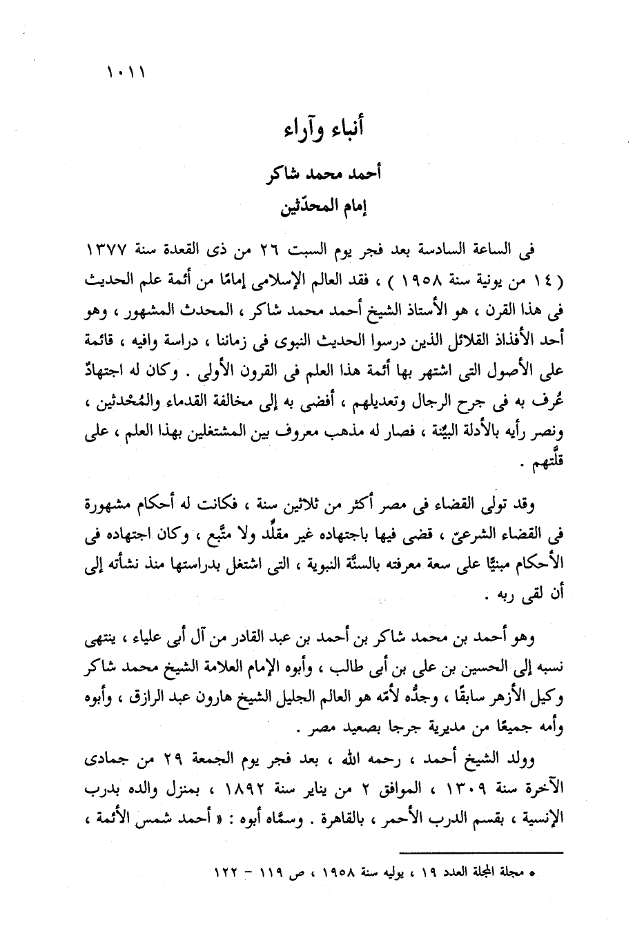 في الساعة السادسة بعد فجر يوم السبت 26 من ذي القعدة سنة 1377 (14 من يونية سنة 1958)، فقد العالم الإسلامي إمامًا من أئمة علم الحديث في هذا القرن، هو الأستاذ الشيخ أحمد محمد شاكر، المحدث المشهور، وهو أحد الأفذاذ القلائل الذين درسوا الحديث النبوى في زماننا، دراسة وافيه، قائمة على الأصول التي اشتهر بها أئمة هذا العلم في القرون الأولى. وكان له اجتهادٌ عُرف به في جرح الرجال وتعديلهم، أفضى به إلى مخالفة القدماء والمُحْدثين، ونصر رأيه بالأدلة البيِّنة، فصار له مذهب معروف بين المشتغلين بهذا العلم، على قلتهم.