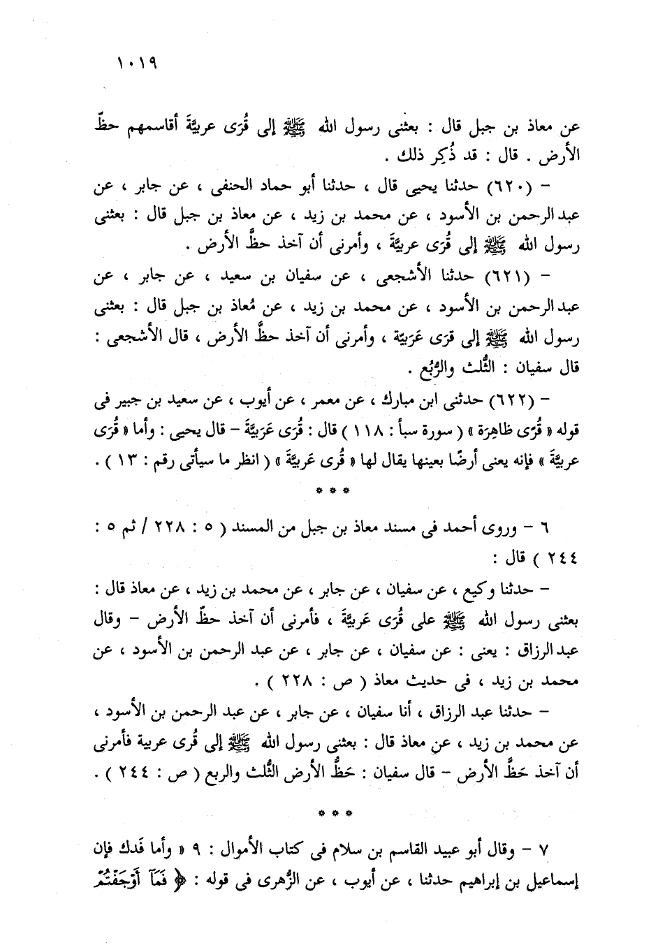 - حدثنا عبد الرزاق، أنا سفيان، عن جابر، عن عبد الرحمن بن الأسود، عن محمد بن زيد، عن معاذ قال: بعثني رسول الله - صلى الله عليه وسلم - إلى قُرى عَرَبِيَّة فأمرني أن آخذ حَظَّ الأرض -قال سفيان: حَظُّ الأرض الثُّلث والربع (ص: 244).