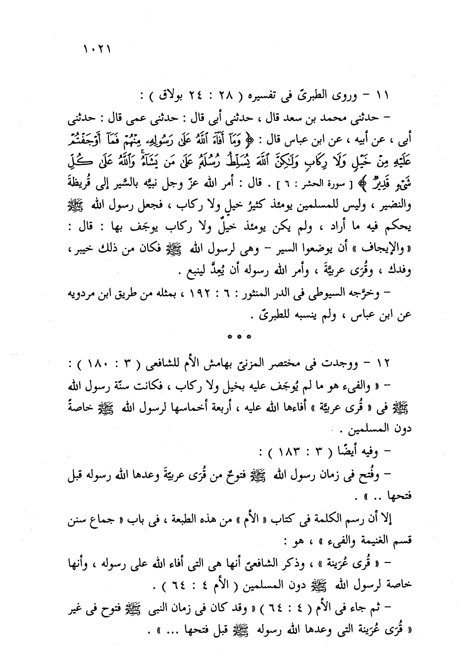 - ثم جاء في الأم (4: 64) "وقد كان في زمان النبي - صلى الله عليه وسلم - فتوح في غير "قُرَى عُرَينة التي وعدها الله رسوله - صلى الله عليه وسلم - قبل فتحها. . . .".
