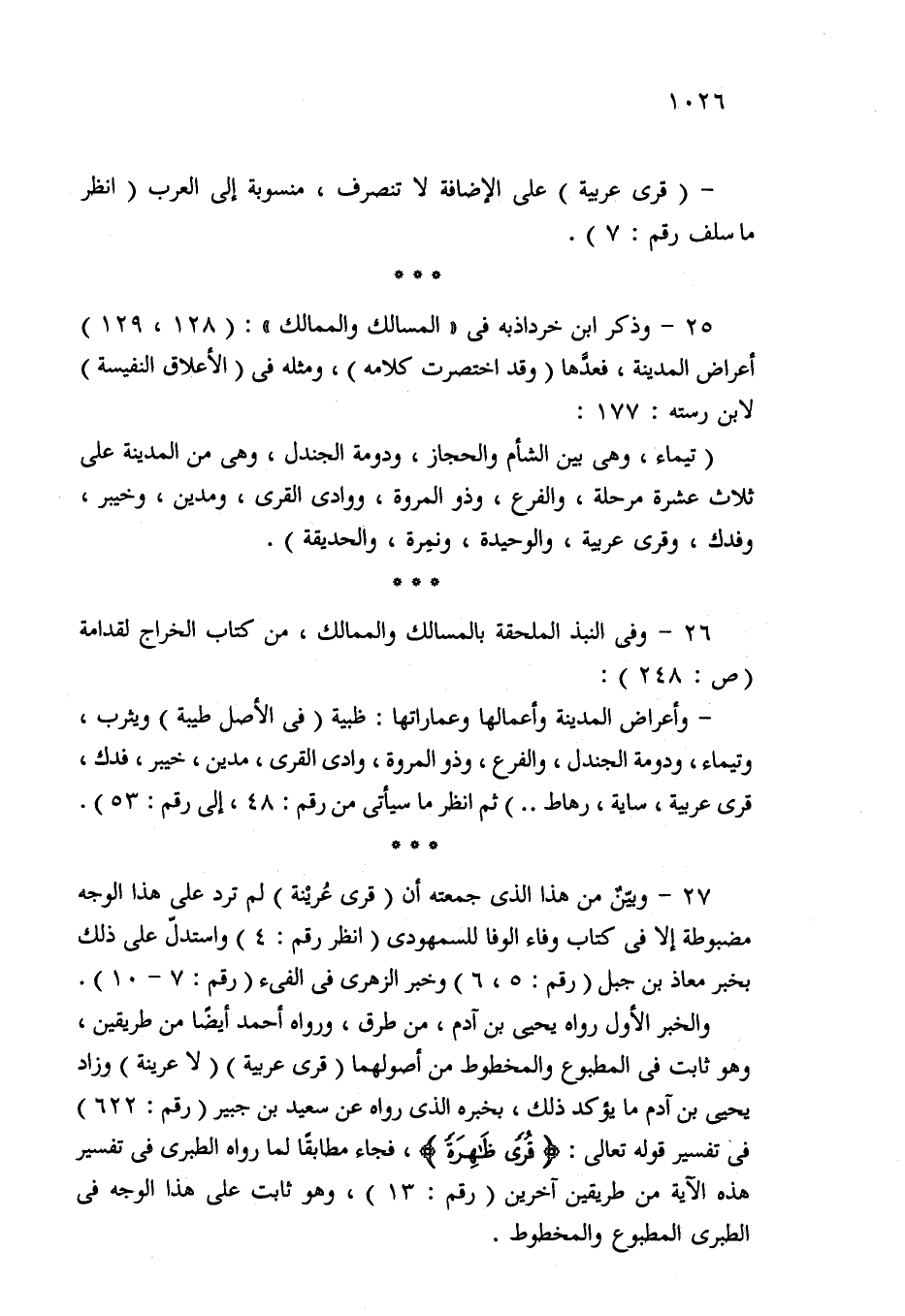 25 - وذكر ابن خرداذبه في "المسالك والممالك": (128، 129) أعراض المدينة، فعدَّها (وقد اختصرت كلامه)، ومثله في (الأعلاق النفيسة) لابن رسته: 177: