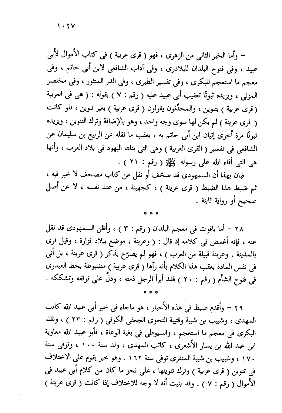 29 - وأقدم ضبط في هذه الأخبار، هو ما جاء في خبر أبي عبيد الله كاتب المهدي، وشبيب بن شيبة وقتيبة النحوى الجعفي الكوفي (رقم: 23)، ونقله البكري في معجم ما استعجم، والسيوطى في بغية الوعاة، فأبو عبيد الله معاوية ابن عبد الله بن يسار الأشعرى، كاتب المهدي، ولد سنة 100، وتوفي سنة 170، وشبيب بن شيبة المنقرى توفي سنة 162. وهو خبر يقوم على الاختلاف في تنوين (قرى عربية) وترك تنوينها، على نحو ما كان من كلام أبي عبيد في الأموال (رقم: 7). وقد بنيت أنَّه لا وجه للاختلاف إذا كانت (قرى عرينة)