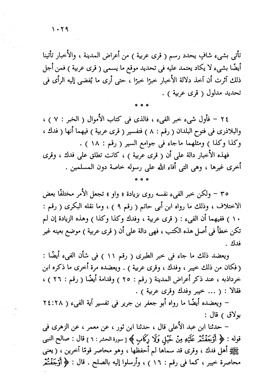 24 - فأول شيء خبر الفيء، فالذي في كتاب الأموال (الخبر: 7)، والبلاذري في فتوح البلدان (رقم: 8) فتفسير (قرى عربية) فيهما أنها (فدك، وكذا وكذا) ومثلهما ما جاء في جوامع السير (رقم: 18).