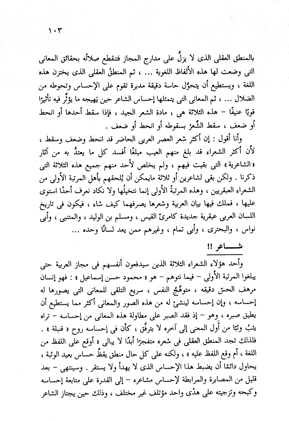 وأحد هؤلاء الشعراء الثلاثة الذين سيدفعون أنفسهم في مجاز العربية حتى يبلغوا المرتبة الأولى -فيما نتوهم- هو "محمود حسن إسماعيل": فهو إنسان مرهف الحسّ دقيقه، متوهِّجُ النفس، سريع التلقى للمعاني التي يصورها له إحساسه، وإن إحساسه لينشئ له من هذه الصور والمعاني أكثر مما يستطيع أن يطيق صبره، وهو -إذ فقد الصبر على مطاولة هذه المعاني من إحساسه- تراه يثبُ وثبًا من أَول المعنى إلى آخره لا يترفَّق، كأن في إحساسه روح "قنبلة". فلذلك تجد المنطق العقلي في شعره متفجرًا أبدًا لا يبالي "أوقع على اللفظ من اللغة، أم وقع اللفظ عليه"، ولكنه على كل حال منطق يقظٌ حساس بعيد الوثبة، يحاول دائمًا أن يضبط هذا الإحساس الذي لا يهدأ ولا يستقر. وسينتهي -بعد قليل من المصابرة والمرابطة لإحساس مشاعره- إلى القدرة على متابعة إحساسه وكبحه وتزجيته على هدْى واحد مؤتلف غير مختلف، وذلك حين يجتاز الشاعر