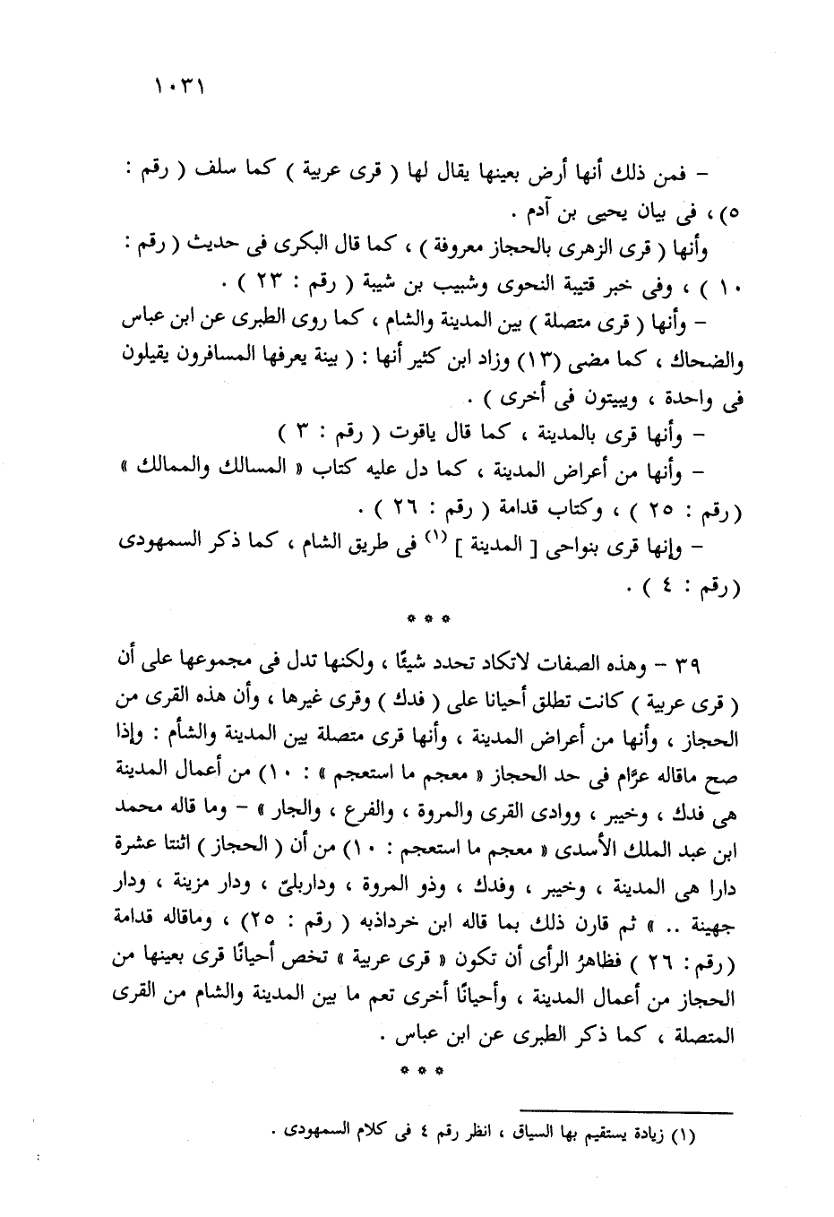 39 - وهذه الصفات لا تكاد تحدد شيئًا، ولكنها تدل في مجموعها على أن (قرى عربية) كانت تطلق أحيانا على (فدك) وقرى غيرها، وأن هذه القرى من الحجاز، وأنها من أعراض المدينة، وأنها قرى متصلة بين المدينة والشأم: وإذا صح ما قاله عرَّام في حد الحجاز "معجم ما استعجم: 10" من أعمال المدينة هي فدك، وخيبر، ووادي القرى والمروة، والفرع، والجار" - وما قاله محمد ابن عبد الملك الأسدى "معجم ما استعجم: 10" من أن (الحجاز) اثنتا عشرة دارا هي المدينة، وخيبر، وفدك، وذو المروة، وداربليّ، ودار مزينة، ودار جهينة. ." ثم قارن ذلك بما قاله ابن خرداذبه (رقم: 25)، وما قاله قدامة (رقم: 26) فظاهرُ الرأي أن تكون "قرى عربية" تخص أحيانا قرى بعينها من الحجاز من أعمال المدينة، وأحيانا أخرى تعم ما بين المدينة والشام من القرى المتصلة، كما ذكر الطبري عن ابن عباس.