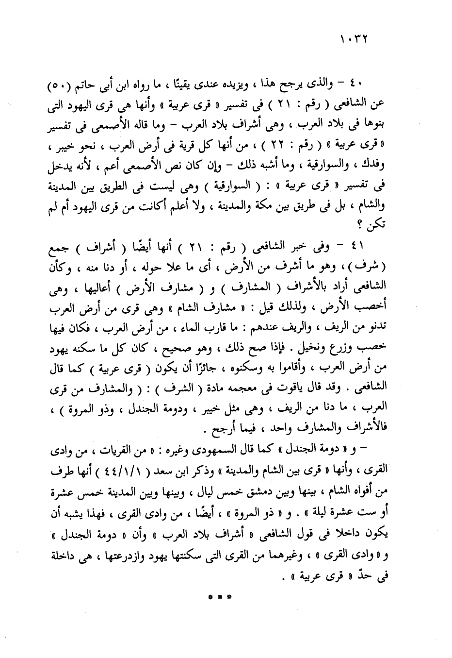 40 - والذي يرجح هذا، ويزيده عندي يقينا، ما رواه ابن أبي حاتم (50) عن الشافعي (رقم: 21) في تفسير "قرى عربية" وأنها هي قرى اليهود التي بنوها في بلاد العرب، وهي أشراف بلاد العرب -وما قاله الأصمعي في تفسير "قرى عربية" (رقم: 22)، من أنها كل قرية في أرض العرب، نحو خيبر، وفدك، والسوارقية، وما أشبه ذلك- وإن كان نص الأصمعى أعم، لأنه يدخل في تفسير "قرى عربية": (السوارقية) وهي ليست في الطريق بين المدينة والشام، بل في طريق بين مكة والمدينة، ولا أعلم أكانت من قرى اليهود أم لم تكن؟