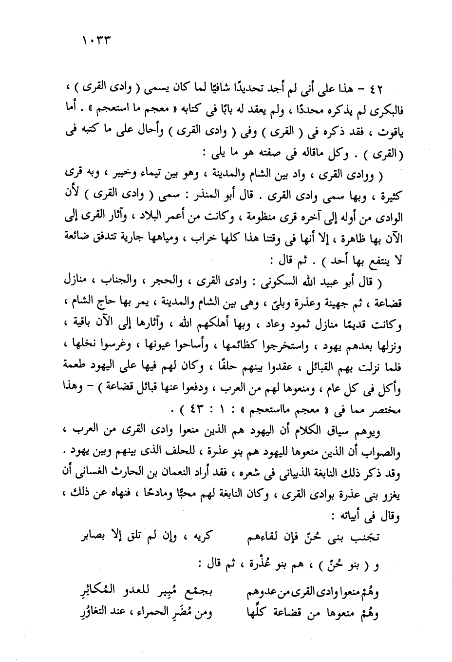 42 - هذا على أنى لم أجد تحديدًا شافيًا لما كان يسمى (وادي القرى)، فالبكرى لم يذكره محددًا، ولم يعقد له بابًا في كتابه "معجم ما استعجم". أما ياقوت، فقد ذكره في (القرى) وفي (وادي القرى) وأحال على ما كتبه في (القرى). وكل ما قاله في صفته هو ما يلي: