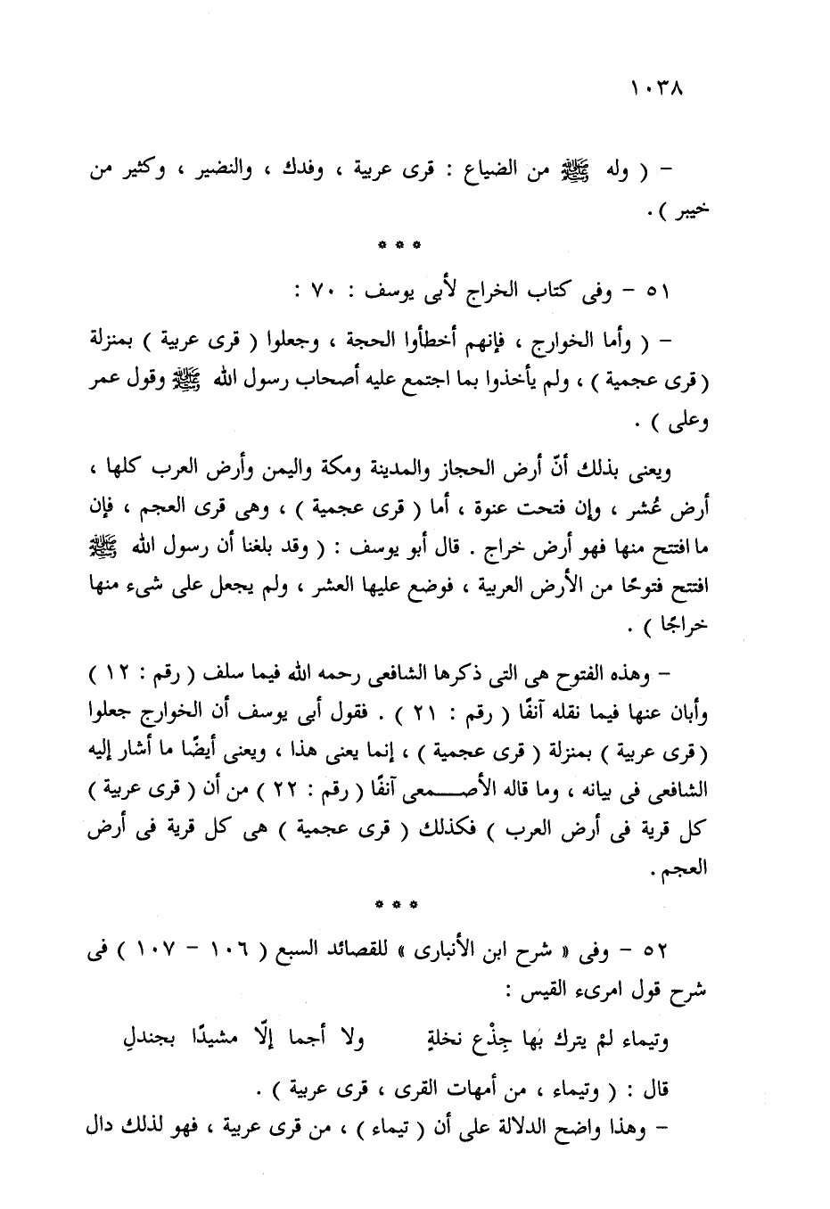- وهذه الفتوح هي التي ذكرها الشافعي -رحمه الله- فيما سلف (رقم: 12) وأبان عنها فيما نقله آنفا (رقم: 21). فقول أبي يوسف أن الخوارج جعلوا (قرى عربية) بمنزلة (قرى عجمية)، إنما يعني هذا، ويعني أيضًا ما أشار إليه الشافعي في بيانه، وما قاله الأصمعي آنفا (رقم: 22) من أن (قرى عربية) كل قرية في أرض العرب) فكذلك (قرى عجمية) هي كل قرية في أرض العجم.