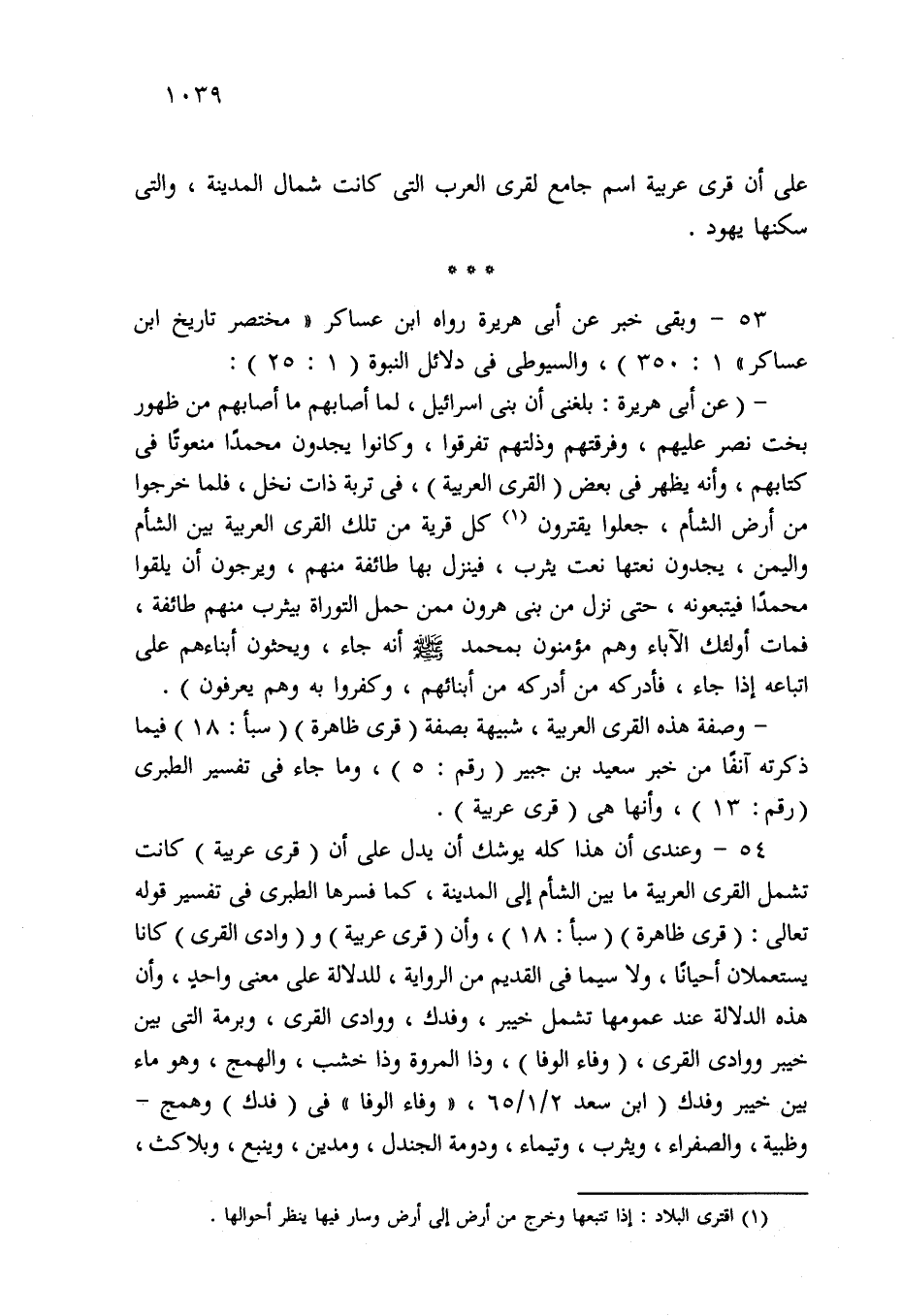 54 - وعندي أن هذا كله يوشك أن يدل على أن (قرى عربية) كانت تشمل القرى العربية ما بين الشأم إلى المدينة، كما فسرها الطبري في تفسير قوله تعالى: (قرى ظاهرة) (سبأ: 18)، وأن (قرى عربية) و (وادي القرى) كانا يستعملان أحيانا، ولاسيما في القديم من الرواية، للدلالة على معنى واحدٍ، وأن هذه الدلالة عند عمومها تشمل خيبر، وفدك، ووادي القرى، وبرمة التي بين خيبر ووادي القرى، (وفاء الوفا)، وذا المروة وذا خشب، والهمج، وهو ماء بين خيبر وفدك (ابن سعد 2/ 1/ 65، "وفاء الوفا" في (فدك) وهمج - وظبية، والصفراء، ويثرب، وتيماء، ودومة الجندل، ومدين، وينبع، وبلاكث،