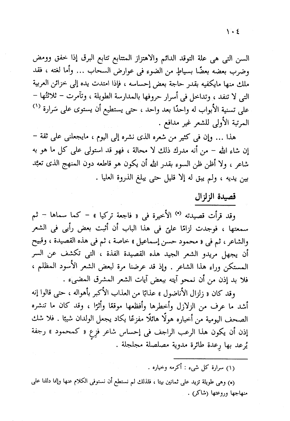 وقد قرأت قصيدته (*) الأخيرة في "فاجعة تركيا" -كما سماها- ثم سمعتها، فوجدت لزامًا عليّ في هذا الباب أن أثبت بعض رأيي في الشعر والشاعر، ثم في "محمود حسن إسماعيل" خاصة، ثم في هذه القصيدة، وقبيح أن يجهل مريدو الشعر الجيد هذه القصيدة الفذة، التي تكشف عن السر المستكن وراء هذا الشاعر. وإذ قد عرضنا مرة لبعض الشعر الأسود المظلم، فلا بد إذن من أن نمحو آيته ببعض آيات الشعر المشرق المضئ.