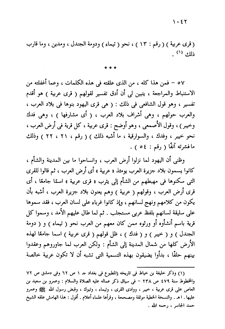 57 - فمن هذا كله، من الَّذي علقته في هذه الكلمات، وعما أغفلته من الاستنباط والمراجعة، يتبين لي أن أدق تفسير لقولهم (قرى عربية) هو أقدم تفسير، وهو قول الشافعي في ذلك: (هي قرى اليهود بنوها في بلاد العرب، والعرب حولهم، وهي أشراف بلاد العرب، (أي مشارفها)، وهي فدك وخيبر)، وقول الأصمعى، وهو أوضح: قرى عربية، كل قرية في أرض العرب، نحو خيبر، وفدك، والسوارقية، ما أشبه ذلك) (رقم، 21، 22) وذلك ما فسّرته آنفًا (رقم: 54).