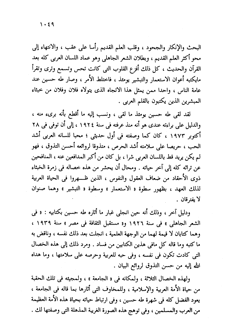 لقد لقى طه حسين يومئذ ما لقى، ونسب إليه ما أقطع بأنه برئ منه، والدليل على براءته عندي هو أنَّه منذ عرفته في سنة 1924، إلى أن توفي في 28 أكتوبر 1973، كان كما وصفته في أول حديثي؛ محبا للسانه العربي أشد الحب، حريصا على سلامته أشد الحرص، متذوقا لروائعه أحسن التذوق، فهو لم يكن يريد قط باللسان العربي شرا، بل كان من أكبر المدافعين عنه، المنافحين عن تراثه كله إلى آخر حياته. ومحال أن يحشر من هذه خصاله في زمرة الخبثاء ذوى الأحقاد من ضعاف العقول والنفوس، الذين ظهروا في الحياة العربية لذلك العهد، بظهور سطوة "الاستعمار" وسطوة "التبشير" وهما صنوان لا يفترقان.