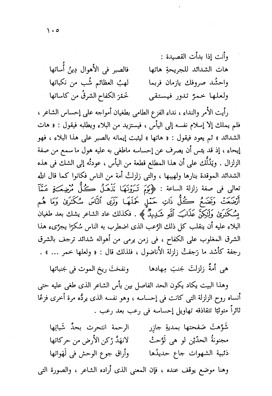 رأيت الأمر والنداء، نداء الفزع الطامي بطغيان أمواجه على إحساس الشاعر، فلم يملك إلا إسلام نفسه إلى اليأس، فيستزيد من البلاء ويطلبه فيقول: "هات الشدائد" ثم يعود فيقول: "هاتها" ليثبت إيمانه بالصبر على هذا البلاء، فهو إيحاء، إذ قد يئس أن يصرف عن إحساسه ما طغى به عليه هول ما سمع من صفة الزلزال. ويَدُلُّك على أن هذا المطلع قطعة من اليأس، عودتُه إلى الشك في هذه الشدائد الموقدة بنارها ولهيبها، والتي زلزلتْ أمة من الناس فكانوا كما قال الله تعالى في صفة زلزلة الساعة: {يَوْمَ تَرَوْنَهَا تَذْهَلُ كُلُّ مُرْضِعَةٍ عَمَّا أَرْضَعَتْ وَتَضَعُ كُلُّ ذَاتِ حَمْلٍ حَمْلَهَا وَتَرَى النَّاسَ سُكَارَى وَمَا هُمْ بِسُكَارَى وَلَكِنَّ عَذَابَ اللَّهِ شَدِيدٌ}. فكذلك عاد الشاعر يشك بعد طغيان البلاء عليه أن ينقلب كل ذلك الرعب الذي اضطرب به الناس سُكرًا يجزِّئ هذا الشرق المغلوب على الكفاح، في زمن يرمى من أهواله شدائد ترجف بالشرق رجفة كأشد ما رَجفتْ زلزلة الأناضول، فلذلك قال: "ولعلها خمر. . . .".