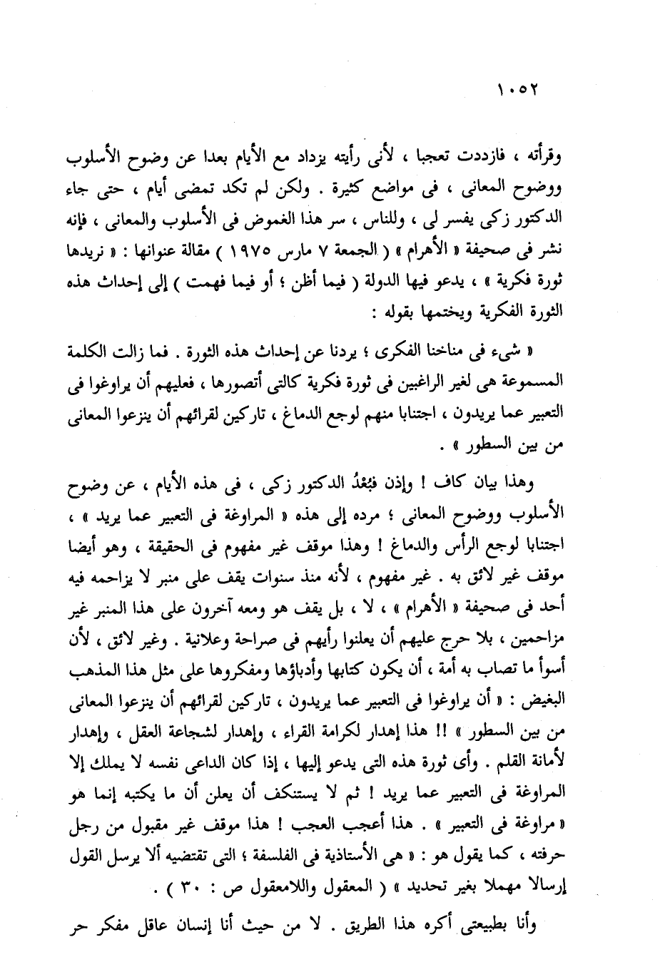 وقرأته، فازددت تعجبا، لأنى رأيته يزداد مع الأيام بعدا عن وضوح الأسلوب ووضوح المعاني، في مواضع كثيرة. ولكن لم تكد تمضي أيام، حتَّى جاء الدكتور زكي يفسر لي، وللناس، سر هذا الغموض في الأسلوب والمعاني، فإنه نشر في صحيفة "الأهرام" (الجمعة 7 مارس 1975) مقالة عنوانها: "نريدها ثورة فكرية"، يدعو فيها الدولة (فيما أظن؛ أو فيما فهمت) الى إحداث هذه الثورة الفكرية ويختمها بقوله: