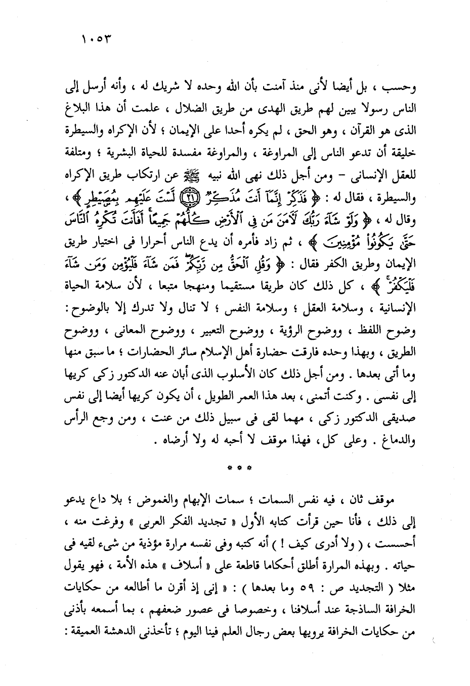 وحسب، بل أيضًا لأنى منذ آمنت بأن الله وحده لا شريك له، وأنه أرسل إلى الناس رسولا يبين لهم طريق الهدى من طريق الضلال، علمت أن هذا البلاغ الَّذي هو القرآن، وهو الحق، لم يكره أحدا على الإيمان؛ لأن الإكراه والسيطرة خليقة أن تدعو الناس إلى المراوغة، والمراوغة مفسدة للحياة البشرية؛ ومتلفة للعقل الإنساني -ومن أجل ذلك نهى الله نبيه - صلى الله عليه وسلم - عن ارتكاب طريق الإكراه والسيطرة، فقال له: {فَذَكِّرْ إِنَّمَا أَنْتَ مُذَكِّرٌ (21) لَسْتَ عَلَيْهِمْ بِمُصَيْطِرٍ}، وقال له، {وَلَوْ شَاءَ رَبُّكَ لَآمَنَ مَنْ فِي الْأَرْضِ كُلُّهُمْ جَمِيعًا أَفَأَنْتَ تُكْرِهُ النَّاسَ حَتَّى يَكُونُوا مُؤْمِنِينَ}، ثم زاد فأمره أن يدع الناس أحرارا في اختيار طريق الإيمان وطريق الكفر فقال: {وَقُلِ الْحَقُّ مِنْ رَبِّكُمْ فَمَنْ شَاءَ فَلْيُؤْمِنْ وَمَنْ شَاءَ فَلْيَكْفُرْ}، كل ذلك كان طريقا مستقيما ومنهجا متبعا، لأن سلامة الحياة الإنسانية، وسلامة العقل؛ وسلامة النفس؛ لا تنال ولا تدرك إلا بالوضوح: وضوح اللفظ، ووضوح الرؤية، ووضوح التعبير، ووضوح المعاني، ووضوح الطريق، وبهذا وحده فارقت حضارة أهل الإسلام سائر الحضارات؛ ما سبق منها وما أتى بعدها. ومن أجل ذلك كان الأسلوب الَّذي أبان عنه الدكتور زكي كريها إلى نفسي. وكنت أتمنى، بعد هذا العمر الطويل، أن يكون كريها أيضًا إلى نفس صديقي الدكتور زكي، مهما لقى في سبيل ذلك من عنت، ومن وجع الرأس والدماغ. وعلى كل، فهذا موقف لا أحبه له ولا أرضاه.