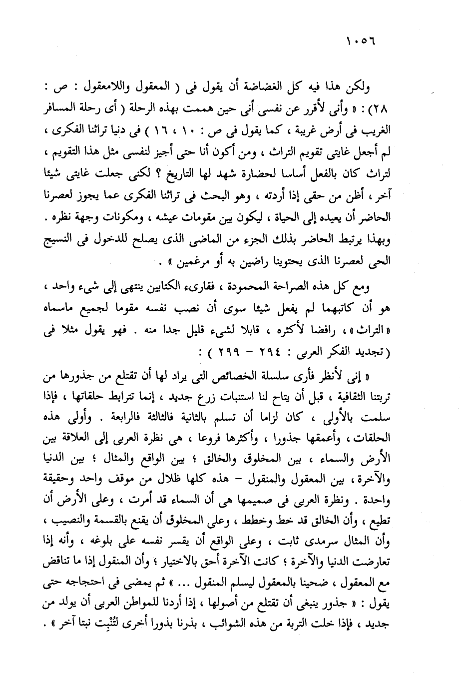 "إني لأنظر فأرى سلسلة الخصائص التي يراد لها أن تقتلع من جذورها من تربتنا الثقافية، قبل أن يتاح لنا استنبات زرع جديد، إنما تترابط حلقاتها، فإذا سلمت بالأولى، كان لزاما أن تسلم بالثانية فالثالثة فالرابعة. وأولى هذه الحلقات، وأعمقها جذورا، وأكثرها فروعا، هي نظرة العربي إلى العلاقة بين الأرض والسماء، بين المخلوق والخالق؛ لين الواقع والمثال؛ بين الدنيا والآخرة، بين المعقول والمنقول -هذه كلها ظلال من موقف واحد وحقيقة واحدة. ونظرة العربي في صميمها هي أن السماء قد أمرت، وعلى الأرض أن تطيع، وأن الخالق قد خط وخطط، وعلى المخلوق أن يقنع بالقسمة والنصيب، وأن المثال سرمدى ثابت، وعلى الواقع أن يقسر نفسه على بلوغه، وأنه إذا تعارضت الدنيا والآخرة؛ كانت الآخرة أحق بالاختيار؛ وأن المنقول إذا ما تناقض مع المعقول، ضحينا بالمعقول ليسلم المنقول. . . ." ثم يمضي في احتجاجه حتَّى يقول: "جذور ينبغي أن تقتلع من أصولها، إذا أردنا للمواطن العربي أن يولد من جديد، فإذا خلت التربة من هذه الشوائب، بذرنا بذورا أخرى لتُنْبِت نبتا آخر".