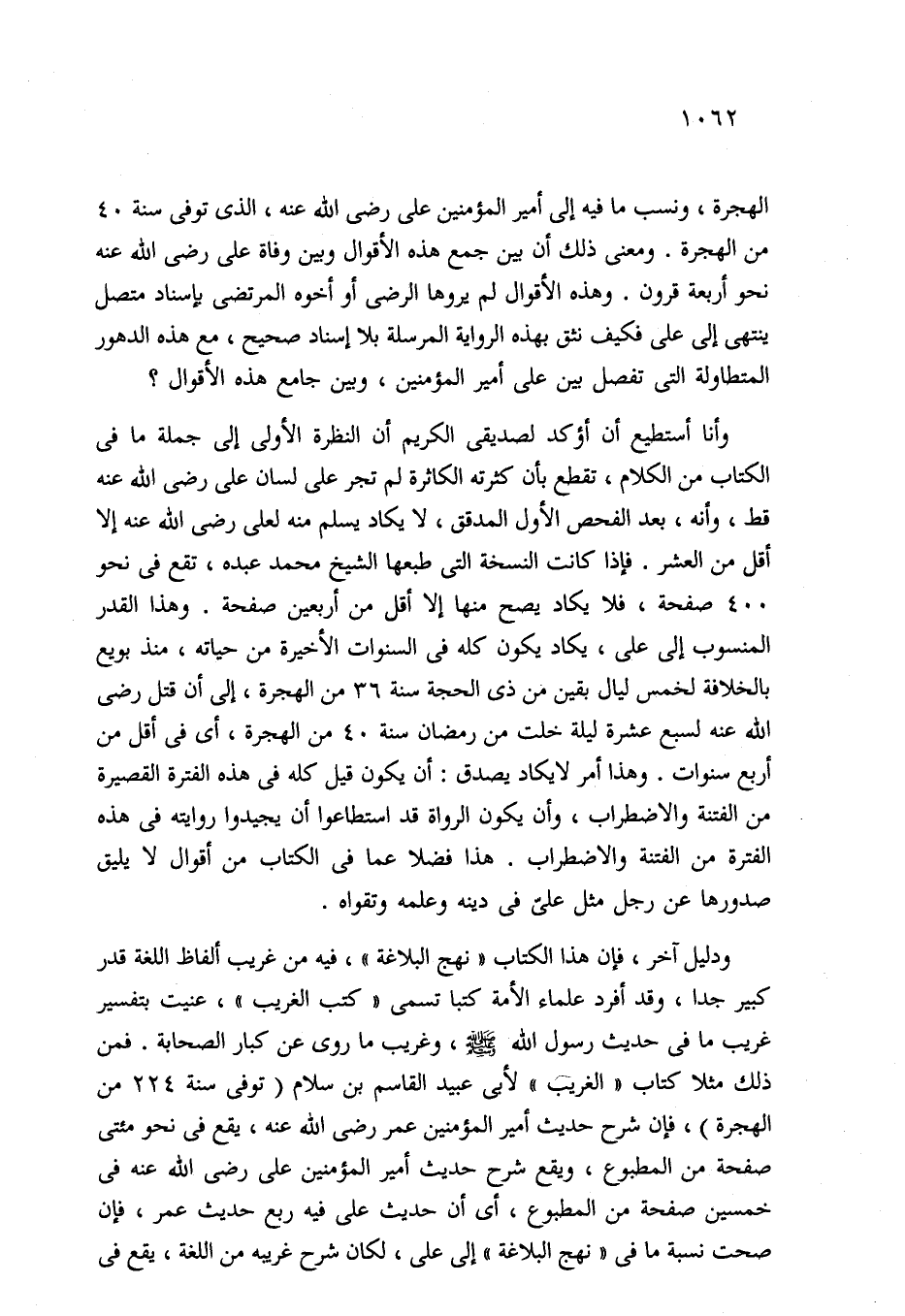 وأنا أستطيع أن أؤكد لصديقي الكريم أن النظرة الأولى إلى جملة ما في الكتاب من الكلام، تقطع بأن كثرته الكاثرة لم تجر على لسان علي - رضي الله عنه - قط، وأنه، بعد الفحص الأول المدقق، لا يكاد يسلم منه لعلي - رضي الله عنه - إلا أقل من العشر. فإذا كانت النسخة التي طبعها الشيخ محمد عبده، تقع في نحو 400 صفحة، فلا يكاد يصح منها إلا أقل من أربعين صفحة. وهذا القدر المنسوب إلى على، يكاد يكون كله في السنوات الأخيرة من حياته، منذ بويع بالخلافة لخمس ليال بقين من ذي الحجة سنة 36 من الهجرة، إلى أن قتل - رضي الله عنه - لسبع عشرة ليلة خلت من رمضان سنة 40 من الهجرة، أي في أقل من أربع سنوات. وهذا أمر لا يكاد يصدق: أن يكون قيل كله في هذه الفترة القصيرة من الفتنة والاضطراب، وأن يكون الرواة قد استطاعوا أن يجيدوا روايته في هذه الفترة من الفتنة والاضطراب. هذا فضلا عما في الكتاب من أقوال لا يليق صدورها عن رجل مثل عليّ في دينه وعلمه وتقواه.