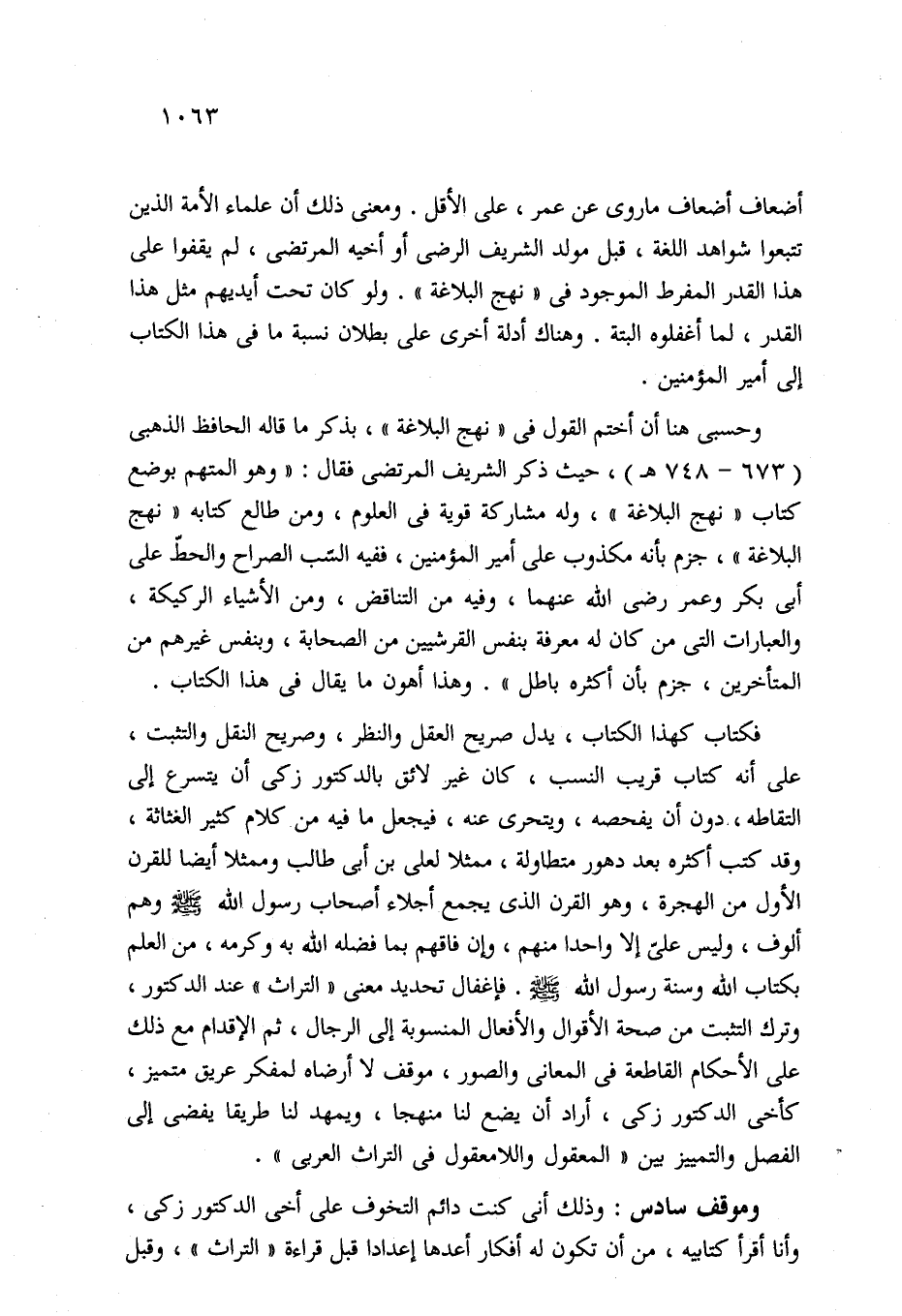 فكتاب كهذا الكتاب، يدل صريح العقل والنظر، وصريح النقل والتثبت، على أنه كتاب قريب النسب، كان غير لائق بالدكتور زكي أن يتسرع إلى التقاطه، دون أن يفحصه، ويتحرى عنه، فيجعل ما فيه من كلام كثير الغثاثة، وقد كتب أكثره بعد دهور متطاولة، ممثلا لعلي بن أبي طالب وممثلا أيضا للقرن الأول من الهجرة، وهو القرن الذي يجمع أجلاء أصحاب رسول الله - صلى الله عليه وسلم - وهم ألوف، وليس على إلا واحدا منهم، وإن فاقهم بما فضله الله به وكرمه، من العلم بكتاب الله وسنة رسول الله - صلى الله عليه وسلم -. فإغفال تحديد معنى "التراث" عند الدكتور، وترك التثبت من صحة الأقوال والأفعال المنسوبة إلى الرجال، ثم الإقدام مع ذلك على الأحكام القاطعة في المعاني والصور، موقف لا أرضاه لمفكر عريق متميز، كأخي الدكتور زكي، أراد أن يضع لنا منهجا، ويمهد لنا طريقا يفضى إلى الفصل والتمييز بين "المعقول واللامعقول في التراث العربي".