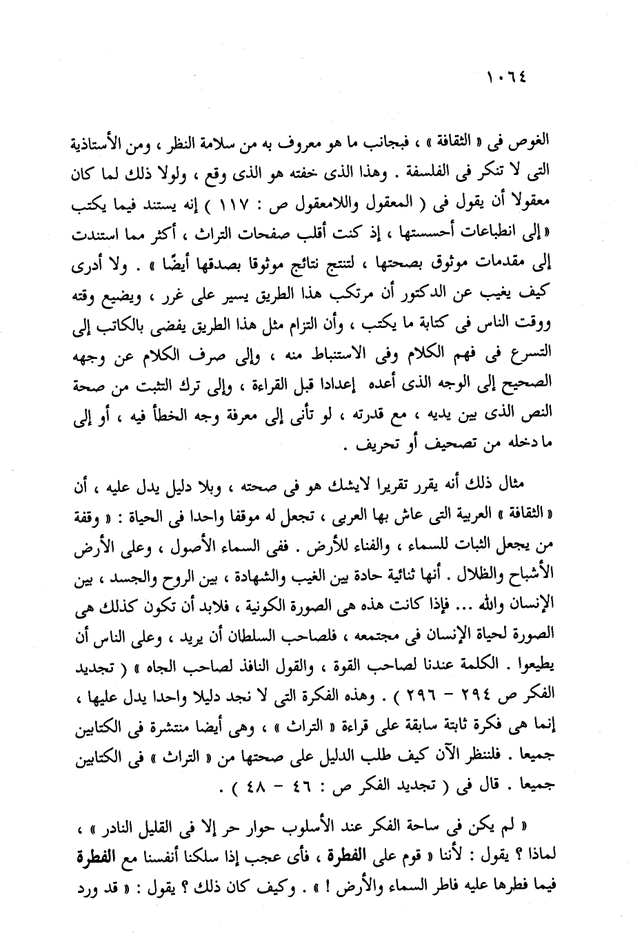 الغوص في "الثقافة"، فبجانب ما هو معروف به من سلامة النظر، ومن الأستاذية التي لا تنكر في الفلسفة. وهذا الذي خفته هو الذي وقع، ولولا ذلك لما كان معقولا أن يقول في (المعقول واللامعقول ص: 117) إنه يستند فيما يكتب "إلى انطباعات أحسستها، إذ كنت أقلب صفحات التراث، أكثر مما استندت إلى مقدمات موثوق بصحتها، لتنتج نتائج موثوقا بصدقها أيضًا". ولا أدري كيف يغيب عن الدكتور أن مرتكب هذا الطريق يسير على غرر، ويضيع وقته ووقت الناس في كتابة ما يكتب، وأن التزام مثل هذا الطريق يفضى بالكاتب إلى التسرع في فهم الكلام وفي الاستنباط منه، وإلى صرف الكلام عن وجهه الصحيح إلى الوجه الذي أعده إعدادا قبل القراءة، وإلى ترك التثبت من صحة النص الذي بين يديه، مع قدرته، لو تأنى إلى معرفة وجه الخطأ فيه، أو إلى ما دخله من تصحيف أو تحريف.