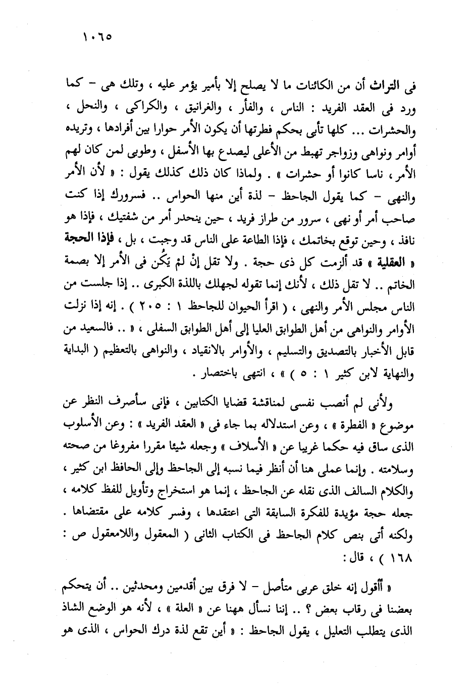 ولأنى لم أنصب نفسي لمناقشة قضايا الكتابين، فإني سأصرف النظر عن موضوع "الفطرة"، وعن استدلاله بما جاء في "العقد الفريد": وعن الأسلوب الذي ساق فيه حكما غريبا عن "الأسلاف" وجعله شيئا مقررا مفروغا من صحته وسلامته. وإنما عملى هنا أن أنظر فيما نسبه إلى الجاحظ وإلى الحافظ ابن كثير، والكلام السالف الذي نقله عن الجاحظ، إنما هو استخراج وتأويل للفظ كلامه، جعله حجة مؤيدة للفكرة السابقة التي اعتقدها، وفسر كلامه على مقتضاها. ولكنه أتى بنص كلام الجاحظ في الكتاب الثاني (المعقول واللامعقول ص: 168)، قال: