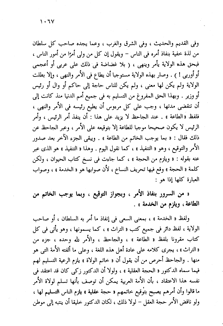 ولفظ "الخدمة"، بمعنى السعي في إنفاذ ما أمر به السلطان، أو صاحب الولاية، لفظ دائر في جميع كتب "التراث"، كما يسمونها، وهو يأتي في كل كتاب مقرونا بلفظ "الطاعة"، والجاحظ، والأمر لله وحده، جزء من "التراث"، يجرى كلامه على عادة أهل هذه اللغة، وعلى ما ألفته الأمة التي هو منها. والجاحظ أحرص من أن يقول أن "خاتم الولاة" يلزم الرعية التسليم لهم فيما سماه الدكتور "الحجة العقلية"، ولولا أن الدكتور زكي كان قد اعتقد في نفسه هذا الاعتقاد، بأن الأمة العربية يمكن أن توصف بأنها تسلم لولاة الأمر ما قالوا وأن أمرهم يصبح بتوقيع خاتمهم "حجة عقلية" يلزم الناس التسليم لها، ولو ناقض الأمر حجة العقل -لولا ذلك، لكان الدكتور خليقا أن ينتبه إلى موطن