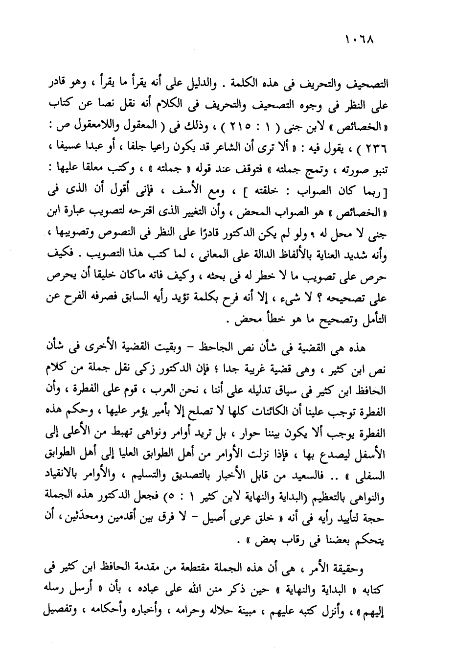 التصحيف والتحريف في هذه الكلمة. والدليل على أنه يقرأ ما يقرأ، وهو قادر على النظر في وجوه التصحيف والتحريف في الكلام أنه نقل نصا عن كتاب "الخصائص" لابن جنى (1: 215)، وذلك في (المعقول واللامعقول ص: 236)، يقول فيه: "ألا ترى أن الشاعر قد يكون راعيا جلفا، أو عبدا عسيفا، تنبو صورته، وتمج جملته" فتوقف عند قوله "جملته"، وكتب معلقا عليها: [ربما كان الصواب: خلقته]، ومع الأسف، فإني أقول أن الذي في "الخصائص" هو الصواب المحض، وأن التغيير الذي اقترحه لتصويب عبارة ابن جنى لا محل له. ولو لم يكن الدكتور قادرًا على النظر في النصوص وتصويبها، وأنه شديد العناية بالألفاظ الدالة على المعاني، لما كتب هذا التصويب. فكيف حرص على تصويب ما لا خطر له في بحثه، وكيف فاته ما كان خليقا أن يحرص على تصحيحه؟ لا شيء، إلا أنه فرح بكلمة تؤيد رأيه السابق فصرفه الفرح عن التأمل وتصحيح ما هو خطأ محض.