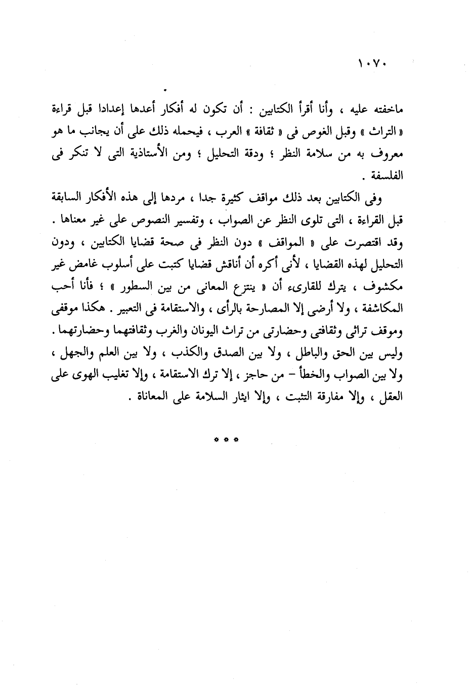 ما خفته عليه، وأنا أقرأ الكتابين: أن تكون له أفكار أعدها إعدادا قبل قراءة "التراث" وقبل الغوص في "ثقافة" العرب، فيحمله ذلك على أن يجانب ما هو معروف به من سلامة النظر؛ ودقة التحليل؛ ومن الأستاذية التي لا تنكر في الفلسفة.