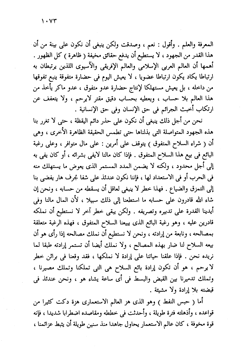 أما (حبس النفط) وهو الذي هز العالم الاستعمارى هزة دكت كثيرا من قواعده، وأذهلته فترة طويلة، وأحدثت في خططه ومقاصده اضطرابا شديدا، فإنه قوة مخوفة، كان عالم الاستعمار يحاول جاهدا منذ سنين طويلة أن يثبط عزائمنا،