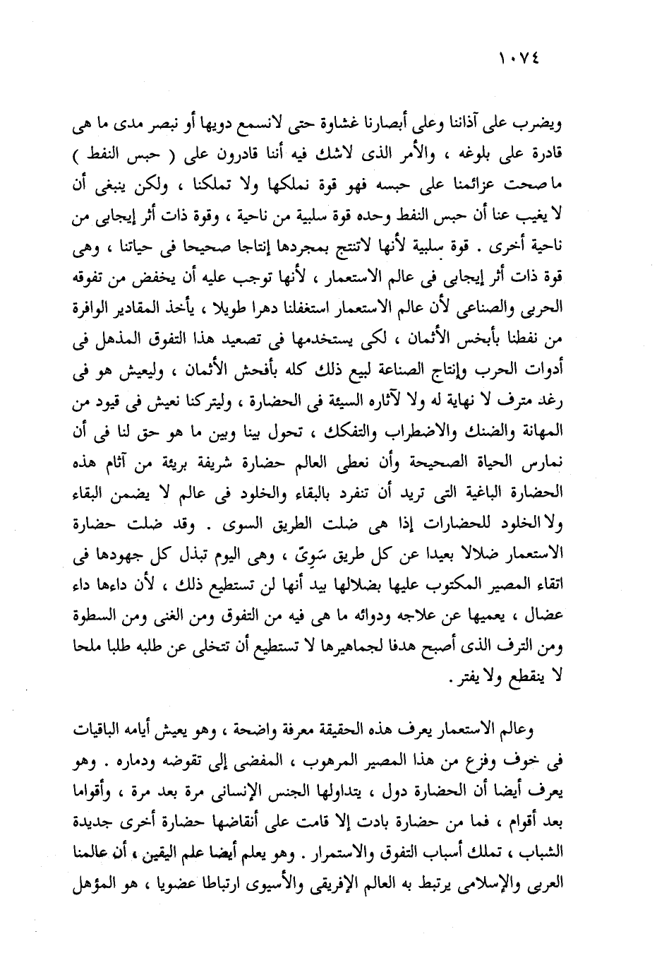 وعالم الاستعمار يعرف هذه الحقيقة معرفة واضحة، وهو يعيش أيامه الباقيات في خوف وفزع من هذا المصير المرهوب، المفضى إلى تقوضه ودماره. وهو يعرف أيضا أن الحضارة دول، يتداولها الجنس الإنساني مرة بعد مرة، وأقواما بعد أقوام، فما من حضارة بادت إلا قامت على أنقاضها حضارة أخرى جديدة الشباب، تملك أسباب التفوق والاستمرار. وهو يعلم أيضا علم اليقين، أن عالمنا العربي والإسلامي يرتبط به العالم الإفريقى والأسيوى ارتباطا عضويا، هو المؤهل