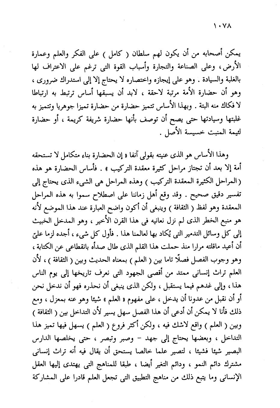 وهذا الأساس هو الذي عنيته بقولي آنفا "إن الحضارة بناء متكامل لا تستحقه أمة إلا بعد أن تجتاز مراحل كثيرة معقدة التركيب". فأساس الحضارة هو هذه (المراحل الكثيرة المعقدة التركيب) وهذه المراحل هي الشيء الذي يحتاج إلى تفسير دقيق صحيح. وقد وقع أهل زماننا على اصطلاح سموا به هذه المراحل المعقدة وهو لفظ (الثقافة) وينبغي أن أكون واضح العبارة عند هذا الموضع لأنه هو منبع الخطر الذي لم نزل نعانيه في هذا القرن الأخير، وهو المدخل الخبيث إلى كل وسائل التدمير التي يُكاد بها لعالمنا هذا. فأول كل شيء، أجده لزما على أن أعيد ما قلته مرارا منذ حملت هذا القلم الذي طال صدأه بانقطاعى عن الكتابة، وهو وجوب الفصل فصلًا تاما بين (العلم) بمعناه الحديث وبين (الثقافة)، لأن العلم تراث إنساني ممتد من أقصى الجهود التي نعرف تاريخها إلى يوم الناس هذا، وإلى غدهم فيما يستقبل، ولكن الذي ينبغي أن نحذره فهو أن ندخل نحن أو أن نقبل من عدونا أن يدخل، على مفهوم "العلم" شيئا وهو عنه بمعزل، ومع ذلك فأنا لا يمكن أن أدعى أن هذا الفصل سهل يسير لأن التداخل بين (الثقافة) وبين (العلم) واقع لا شك فيه، ولكن أكثر فروع (العلم) يسهل فيها تميز هذا التداخل، وبعضها يحتاج إلى جهد -وصبر وتبصر، حتى يخلصها الدارس البصير شيئا فشيئا، لتصير علما خالصا يستحق أن يقال فيه أنه تراث إنساني مشترك دائم النمو، ودائم التغير أيضا، طبقا للمناهج التي يهتدى إليها العقل الإنساني وما يتبع ذلك من مناهج التطبيق التي تجعل العلم قادرا على المشاركة