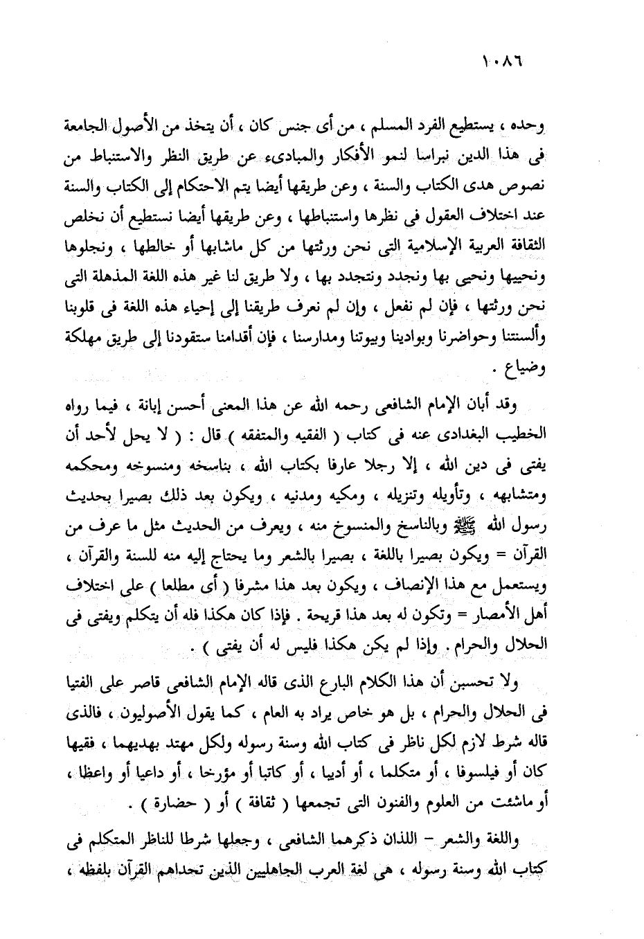 ولا تحسبن أن هذا الكلام البارع الذي قاله الإمام الشافعي قاصر على الفتيا في الحلال والحرام، بل هو خاص يراد به العام، كما يقول الأصوليون، فالذي قاله شرط لازم لكل ناظر في كتاب الله وسنة رسوله ولكل مهتد بهديهما، فقيها كان أو فيلسوفا، أو متكلما، أو أدبيا، أو كاتبا أو مؤرخا، أو داعيا أو واعظا، أو ما شئت من العلوم والفنون التي تجمعها (ثقافة) أو (حضارة).