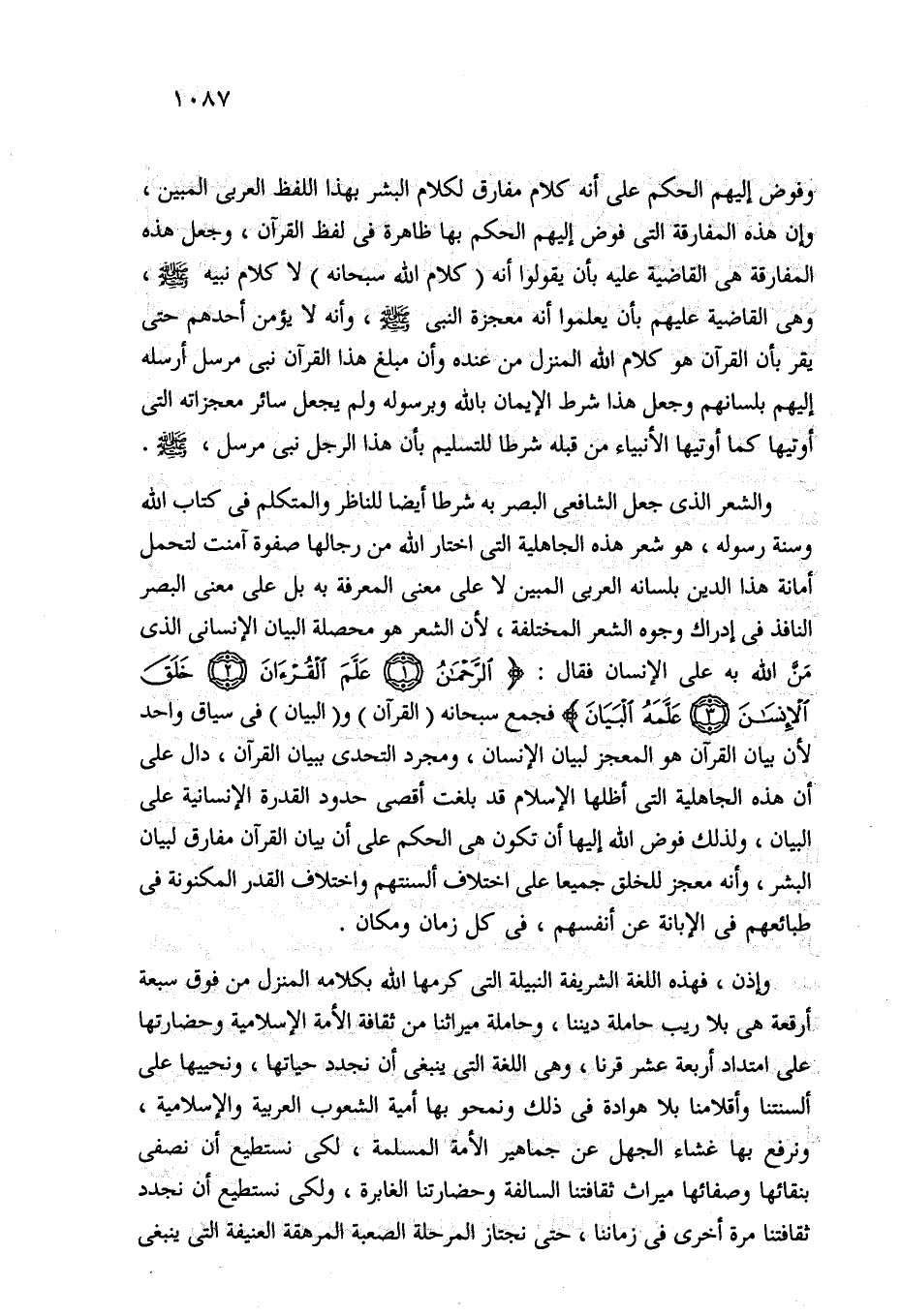 والشعر الذي جعل الشافعي البصر به شرطا أيضا للناظر والمتكلم في كتاب الله وسنة رسوله، هو شعر هذه الجاهلية التي اختار الله من رجالها صفوة آمنت لتحمل أمانة هذا الدين بلسانه العربي المبين لا على معنى المعرفة به بل على معنى البصر النافذ في إدراك وجوه الشعر المختلفة، لأن الشعر هو محصلة البيان الإنساني الذي مَنَّ الله به على الإنسان فقال: {الرَّحْمَنُ (1) عَلَّمَ الْقُرْآنَ (2) خَلَقَ الْإِنْسَانَ (3) عَلَّمَهُ الْبَيَانَ} فجمع سبحانه (القرآن) و (البيان) في سياق واحد لأن بيان القرآن هو المعجز لبيان الإنسان، ومجرد التحدى ببيان القرآن، دال على أن هذه الجاهلية التي أظلها الإسلام قد بلغت أقصى حدود القدرة الإنسانية على البيان، ولذلك فوض الله إليها أن تكون هي الحكم على أن بيان القرآن مفارق لبيان البشر، وأنه معجز للخلق جميعا على اختلاف ألسنتهم واختلاف القدر المكنونة في طبائعهم في الإبانة عن أنفسهم، في كل زمان ومكان.