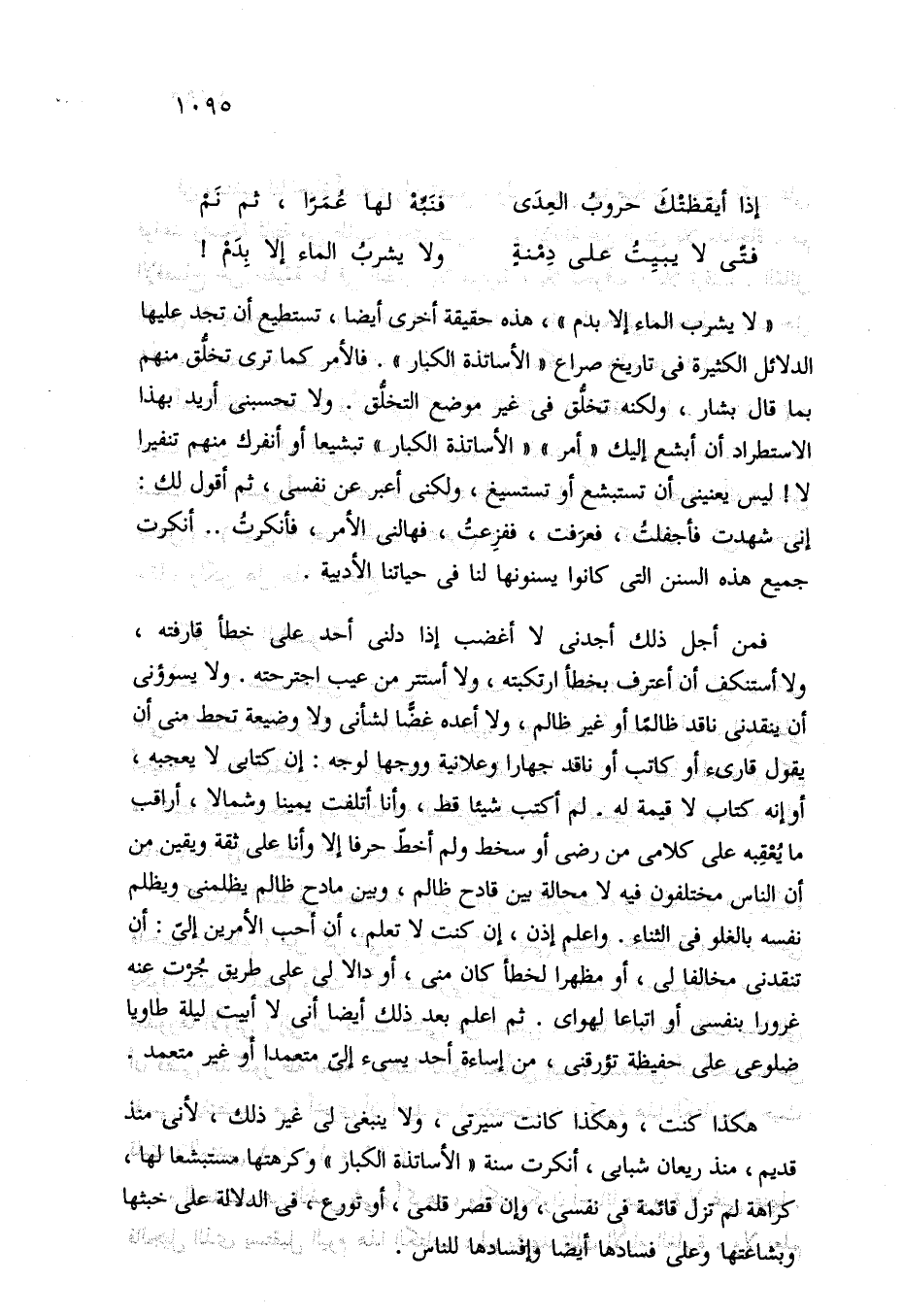 "لا يشرب الماء إلا بدم"، هذه حقيقة أخرى أيضا، تستطيع أن تجد عليها الدلائل الكثيرة في تاريخ صراع "الأساتذة الكبار". فالأمر كما ترى تخلُّق منهم بما قال بشار، ولكنه تخلُّق في غير موضع التخلُّق. ولا تحسبنى أريد بهذا الاستطراد أن أبشع إليك "أمر" "الأساتذة الكبار" تبشيعا أو أنفرك منهم تنفيرا لا! ليس يعنينى أن تستبشع أو تستسيغ، ولكني أعبر عن نفسي، ثم أقول لك: إني شهدت فأجفلتُ، فعرَفت، ففزِعتُ، فهالنى الأمر، فأنكرتُ .. أنكرت جميع هذه السنن التي كانوا يسنونها لنا في حياتنا الأدبية.