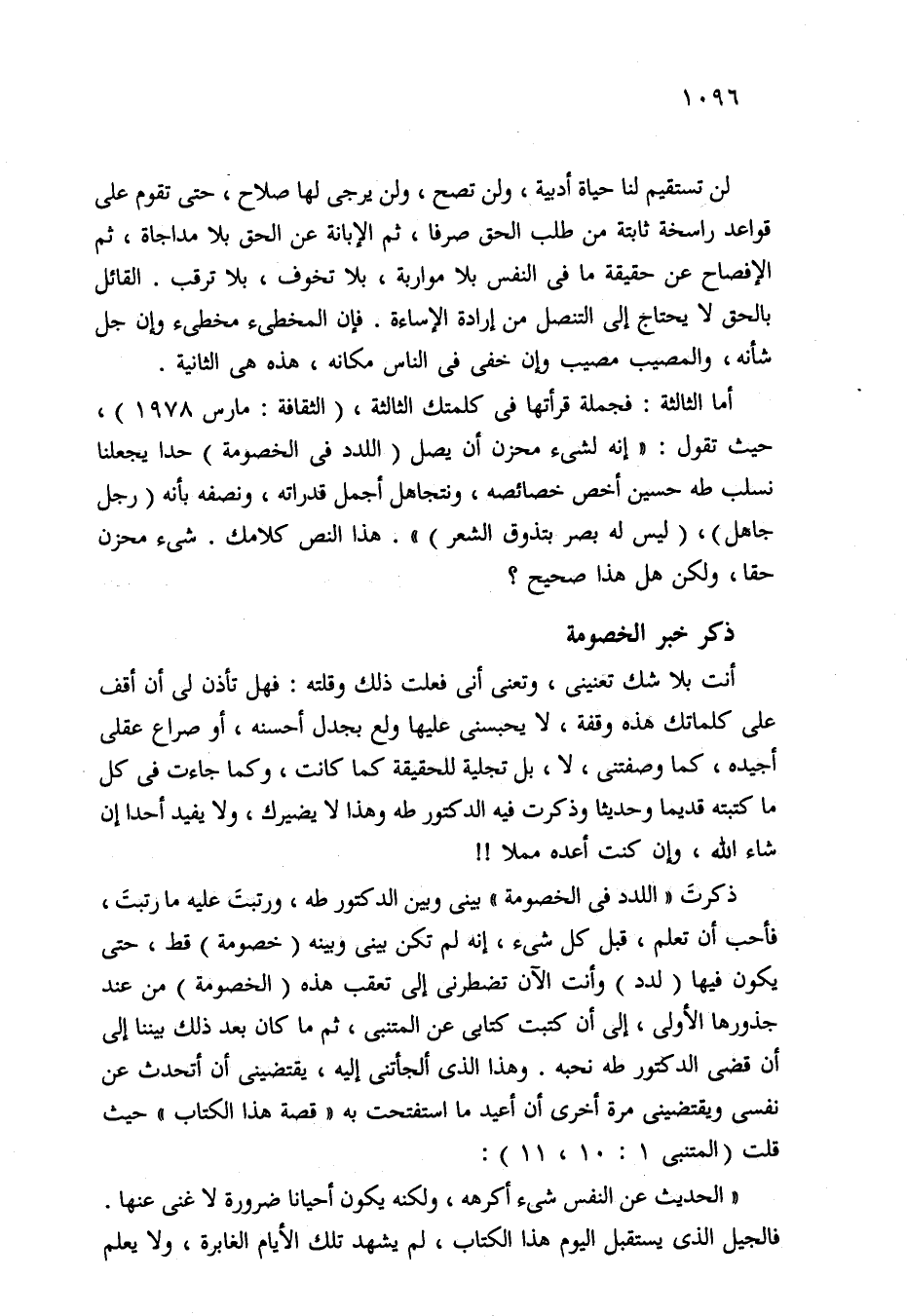 ذكرتَ "اللدد في الخصومة" بيني وبين الدكتور طه، ورتبتَ عليه ما رتبتَ، فأحب أن تعلم، قبل كل شيء، إنه لم تكن بيني وبينه (خصومة) قط، حتى يكون فيها (لدد) وأنت الآن تضطرنى الى تعقب هذه (الخصومة) من عند جذورها الأولى، الى أن كتبت كتابى عن المتنبي، ثم ما كان بعد ذلك بيننا إلى أن قضى الدكتور طه نحبه. وهذا الذي ألجأتنى إليه، يقتضينى أن أتحدث عن نفسي ويقتضينى مرة أخرى أن أعيد ما استفتحت به "قصة هذا الكتاب" حيث قلت (المتنبي 1: 10، 11):