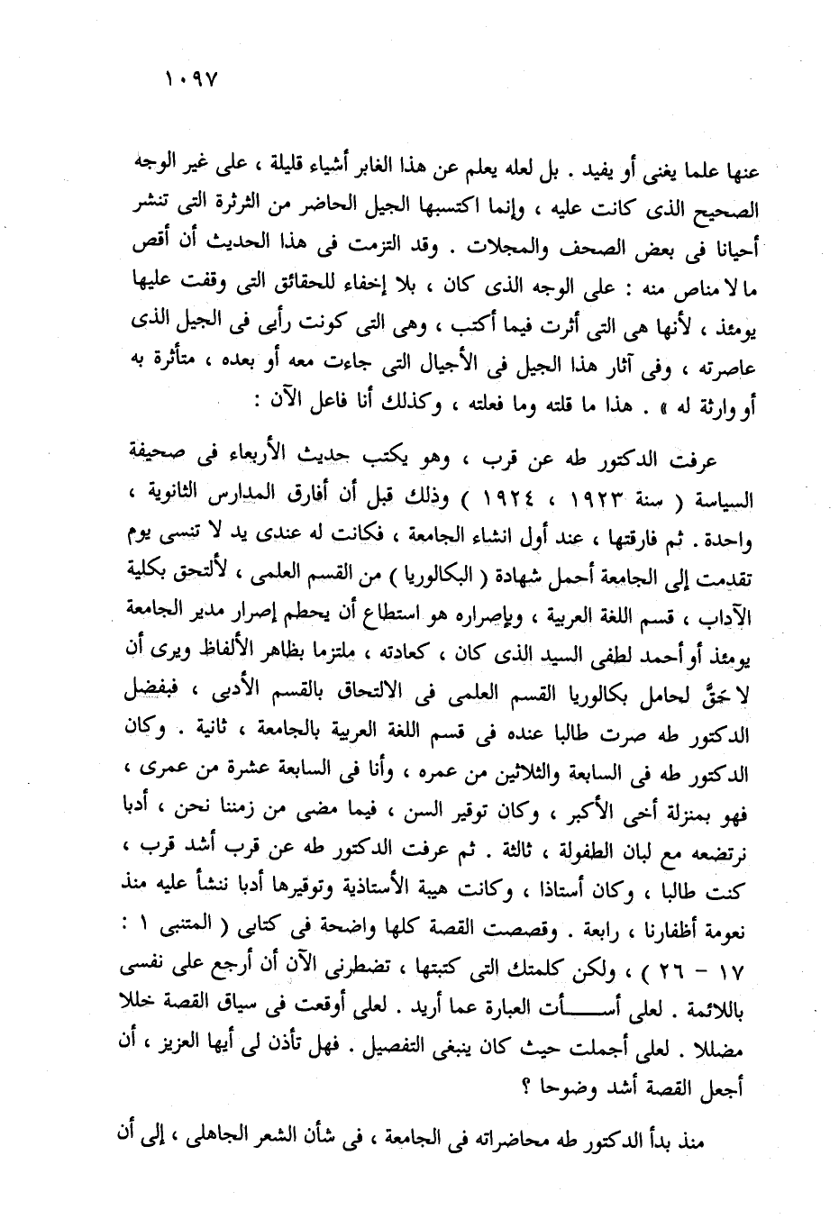 عرفت الدكتور طه عن قرب، وهو يكتب بحديث الأربعاء في صحيفة السياسة (سنة 1923، 1924) وذلك قبل أن أفارق المدارس الثانوية، واحدة. ثم فارقتها، عند أول إنشاء الجامعة، فكانت له عندي يد لا تنسى يوم تقدمت إلى الجامعة أحمل شهادة (البكالوريا) من القسم العلمي، لألتحق بكلية الآداب، قسم اللغة العربية، وبإصراره هو استطاع أن يحطم إصرار مدير الجامعة يومئذ أو أحمد لطفي السيد الذي كان، كعادته، ملتزما بظاهر الألفاظ ويرى أن لا حَقَّ لحامل بكالوريا القسم العلمي في الالتحاق بالقسم الأدبى، فبفضل الدكتور طه صرت طالبا عنده في قسم اللغة العربية بالجامعة، ثانية. وكان الدكتور طه في السابعة والثلاثين من عمره، وأنا في السابعة عشرة من عمرى، فهو بمنزلة أخي الأكبر، وكان توقير السن، فيما مضى من زمننا نحن، أدبا نرتضعه مع لبان الطفولة، ثالثة. ثم عرفت الدكتور طه عن قرب أشد قرب، كنت طالبا، وكان أستاذا، وكانت هيبة الأستاذية وتوقيرها أدبا ننشأ عليه منذ نعومة أظفارنا، رابعة. وقصصت القصة كلها واضحة في كتابي (المتنبي 1: 17 - 26)، ولكن كلمتك التي كتبتها، تضطرنى الآن أن أرجع على نفسي باللائمة. لعلى أسأت العبارة عما أريد. لعلى أوقعت في سياق القصة خللا مضللا. لعلى أجملت حيث كان ينبغي التفصيل. فهل تأذن لي أيها العزيز، أن أجعل القصة أشد وضوحا؟