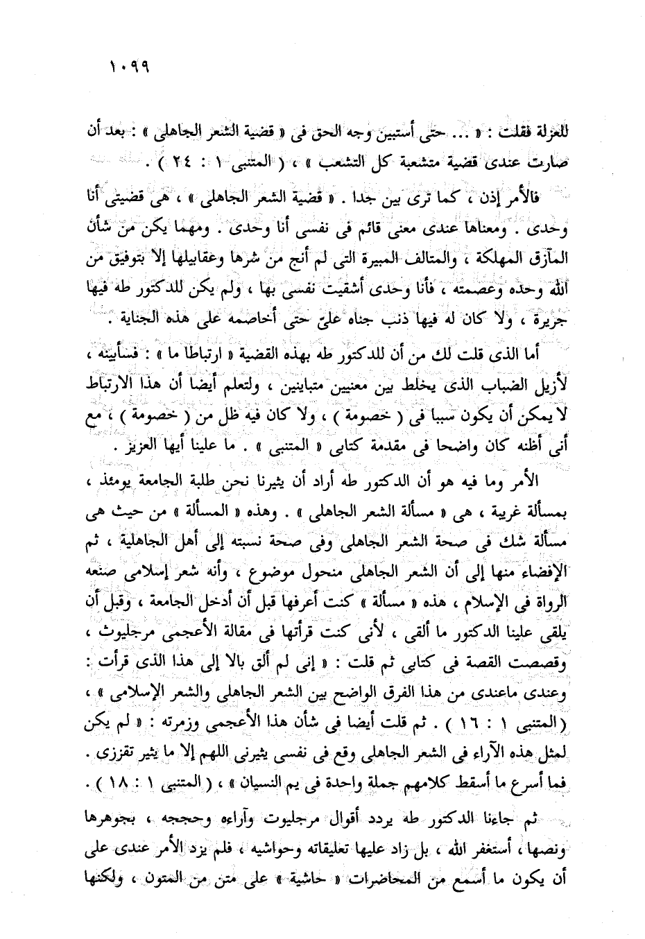 فالأمر إذن، كما ترى بين جدا. "قضية الشعر الجاهلي"، هي قضيتى أنا وحدي. ومعناها عندي معنى قائم في نفسي أنا وحدي. ومهما يكن من شأن المآزق المهلكة، والمتالف المبيرة التي لم أنج من شرها وعقابيلها إلا بتوفيق من الله وحده وعصمته، فأنا وحدي أشقيت نفسي بها، ولم يكن للدكتور طه فيها جريرة، ولا كان له فيها ذنب جناه على حتى أخاصمه على هذه الجناية.