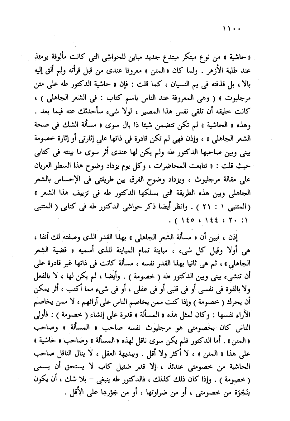 "حاشية" من نوع مبتكر مبتدع جديد مباين للحواشي التي كانت مألوفة يومئذ عند طلبة الأزهر. ولما كان "المتن" معروفا عندي من قبل قرأته ولم ألق إليه بالا، بل قذفته في يم النسيان، كما قلت: فإن "حاشية الدكتور طه على متن مرجليوت" (وهي المعروفة عند الناس باسم كتاب: في الشعر الجاهلي)، كانت خليقه أن تلقى نفس هذا المصير، لولا شيء سأحدثك عنه فيما بعد. وهذه "الحاشية" لم تكن تتضمن شيئا ذا بال سوى "مسألة الشك في صحة الشعر الجاهلي"، وإذن فهي لم تكن قادرة في ذاتها على إثارتى أو إثارة خصومة بيني وبين صاحبها الدكتور طه ولم يكن لها عندي أثر سوى ما بينته في كتابى حيث قلت: "تتابعت المحاضرات، وكل يوم يزداد وضوح هذا السطو العريان على مقالة مرجليوث، ويزداد وضوح الفرق لكن طريقتى في الإحساس بالشعر الجاهلي وبين هذه الطريقة التي يسلكها الدكتور طه في تزييف هذا الشعر" (المتنبي 1: 21). وانظر أيضا ذكر حواشي الدكتور طه في كتابي (المتنبي 1: 20، 144، 145).