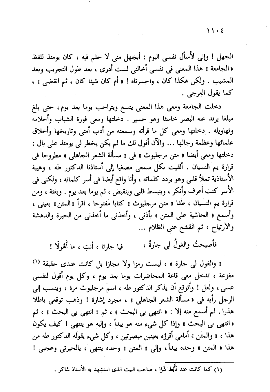 دخلت الجامعة ومعي هذا المعنى يتسع ويتراحب يوما بعد يوم، حتى بلغ مبلغا يرتد عنه البصر خاسئا وهو حسير. دخلتها ومعى فورة الشباب وأحلامه وتهاويله. دخلتها ومعى كل ما قرأته وسمعته من أدب أمتى وتاريخها وأخلاق علمائها وعظمة رجالها. . . والآن أقول لك ما لم يكن يخطر لي يومئذ على بال: دخلتها ومعى أيضا "متن مرجليوث" في "مسألة الشعر الجاهلي" مطروحا في قرارة يم النسيان. ألقيت بكل سمعى مصغيا إلى أستاذنا الدكتور طه، وهيبة الأستاذية تملأ قلبي وهو يردد كلماته، وأنا واقع أيضا في أسر كلماته، ولكني في الأسر كنت أعرف وأنكر، وينبسط قلبي وينقبض، ثم يوما بعد يوم. وبغتة، ومن قرارة يم النسيان، طفا "متن مرجليوث" كتابا مفتوحا، اقرأ "المتن" بعيني، وأسمع "الحاشية على المتن" بأذنى، وأخذنى ما أخذنى من الحيرة والدهشة والارتياح، ثم انقشع عني الظلام. . .