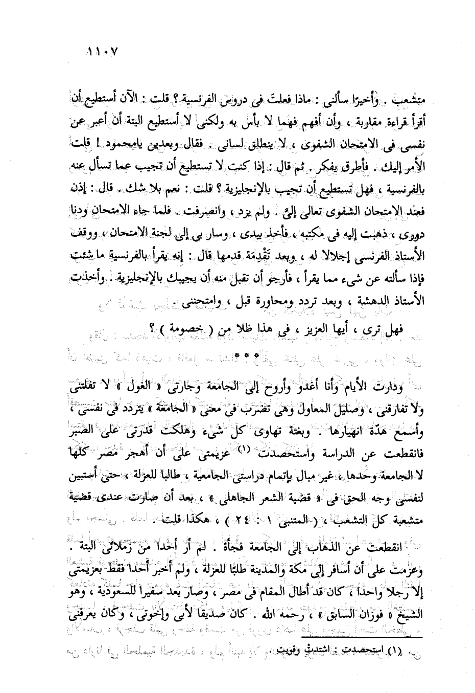 انقطعت عن الذهاب إلى الجامعة فجأة. لم أر أحدًا من زملائي البتة. وعزمت على أن أسافر إلى مكة والمدينة طلبًا للعزلة، ولم أخبر أحدًا فقط بعزيمتي إلا رجلا واحدا، كان قد أطال المقام في مصر، وصار بعد سفيرا للسعودية، وهو الشيخ "فوزان السابق"، -رحمه الله- كان صديقًا لأبي وإخوتي، وكان يعرفني