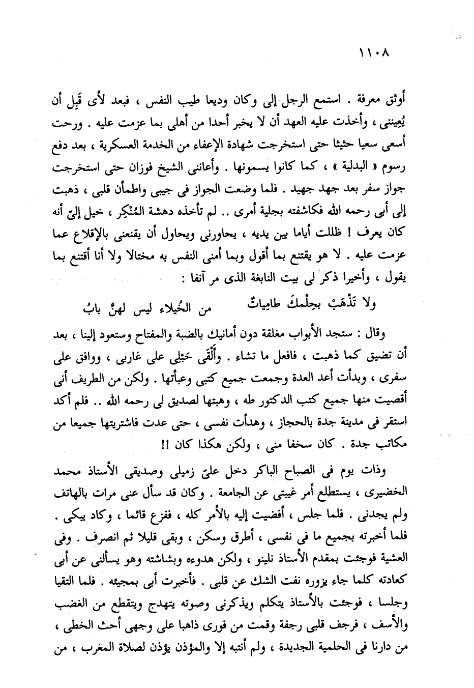 وقال: ستجد الأبواب مغلقة دون أمانيك بالضبة والمفتاح وستعود إلينا، بعد أن تضيق كما ذهبت، فافعل ما تشاء. وأَلْقَى حَبلى على غاربى، ووافق على سفرى، وبدأت أعد العدة وجمعت جميع كتبى وعبأتها. ولكن من الطريف أنى أقصيت منها جميع كتب الدكتور طه، وهبتها لصديق لي -رحمه الله- .. فلم أكد استقر في مدينة جدة بالحجاز، وهدأت نفسي، حتى عدت فاشتريتها جميعا من مكاتب جدة. كان سخفا مني، ولكن هكذا كان! !