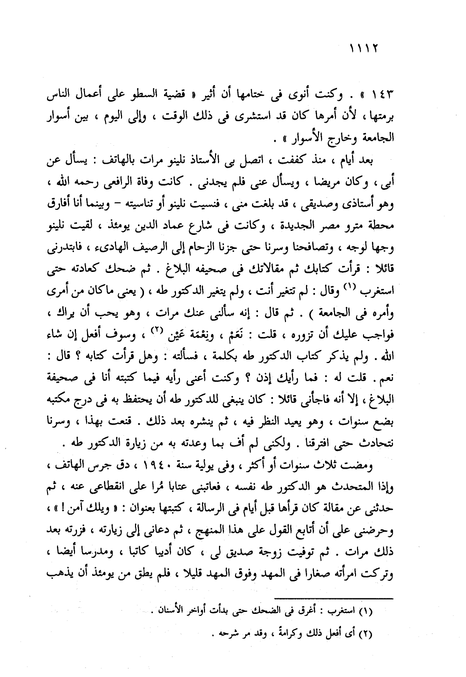 ومضت ثلاث سنوات أو أكثر، وفي يولية سنة 1940، دق جرس الهاتف، وإذا المتحدث هو الدكتور طه نفسه، فعاتبنى عتابا مُرا على انقطاعى عنه، ثم حدثني عن مقالة كان قرأها قبل أيام في الرسالة، كتبتها بعنوان: "ويلك آمن! "، وحرضنى على أن أتابع القول على هذا المنهج، ثم دعانى إلى زيارته، فزرته بعد ذلك مرات. ثم توفيت زوجة صديق لي، كان أديبا كاتبا، ومدرسا أيضا، وتركت امرأته صغارا في المهد وفوق المهد قليلا، فلم يطق من يومئذ أن يذهب