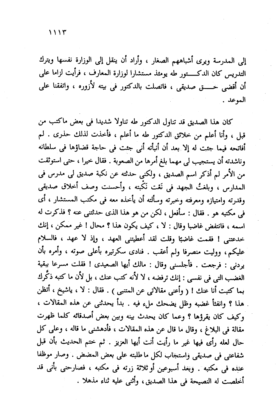 كان هذا الصديق قد تناول الدكتور طه تناولا شديدا في بعض ما كتب من قبل، وأنا أعلم من خلائق الدكتور طه ما أعلم، فأخذت لذلك حذرى. لم أفاتحه فيما جئت له إلا بعد أن أنبأته أنى جئت في حاجة قضاؤها في سلطانه وناشدته أن يستجيب لي مهما بلغ أمرها من الصعوبة. فقال خيرا، حتى استوثقت من الأمر لم أذكر اسم الصديق، ولكني حدثته عن نكبة صديق لي مدرس في المدارس، وبلغتُ الجهد في نَعْت نَكْبته، وأحسنت وصف أخلاق صديقي وقدرته وامتيازه ومعرفته وخبرته وسألته أن يأخذه معه في مكتب المستشار، أي في مكتبه هو. فقال: سأفعل، لكن من هو هذا الذي حدثتنى عنه؟ فذكرت له اسمه، فانتفض غاضبا وقال: لا، كيف يكون هذا؟ محال! غير ممكن، إنك خدعتنى! فقمت غاضبًا وقلت لقد أعطيتنى العهد، وإذ لا عهد، فالسلام عليكم، ووليت منصرفا ولم أعقب. فنادى سكرتيره بأعلى صوته، وأمره بأن يردنى: فرجعت. فأجلسنى وقال: مالك أيها الصعيدى! فقلت مسرعا ببقية الغضب التي في نفسي: إنك ترفضه، لا لأنه كتب عنك، بل لأن ما كتبه ذكَّرك بما كتبت أنا عنك! (وأعني مقالاتى عن المتنبي). فقال: لا، يا شيخ، أتظن هذا؟ وانفثأ غضبه وظل يضحك ملء فيه. بدأ يحدثني عن هذه المقالات، وكيف كان يقرؤها؟ وعما كان يحدث بينه وبين بعض أصدقائه كلما ظهرت مقالة في البلاغ، وقال ما قال عن هذه المقالات، فأدهشنى ما قاله، وعلى كل حال لعله رأى فيها غير ما رأيت أنت أيها العزيز. ثم ختم الحديث بأن قبل شفاعتى في صديقي واستجاب لكل ما طلبته على بعض المضض. وصار موظفا عنده في مكتبه. وبعد أسبوعين أو ثلاثة زرته في مكتبه، فصارحنى بأنى قد أخلصت له النصيحة في هذا الصديق، وأثنى عليه ثناء مذهلا.