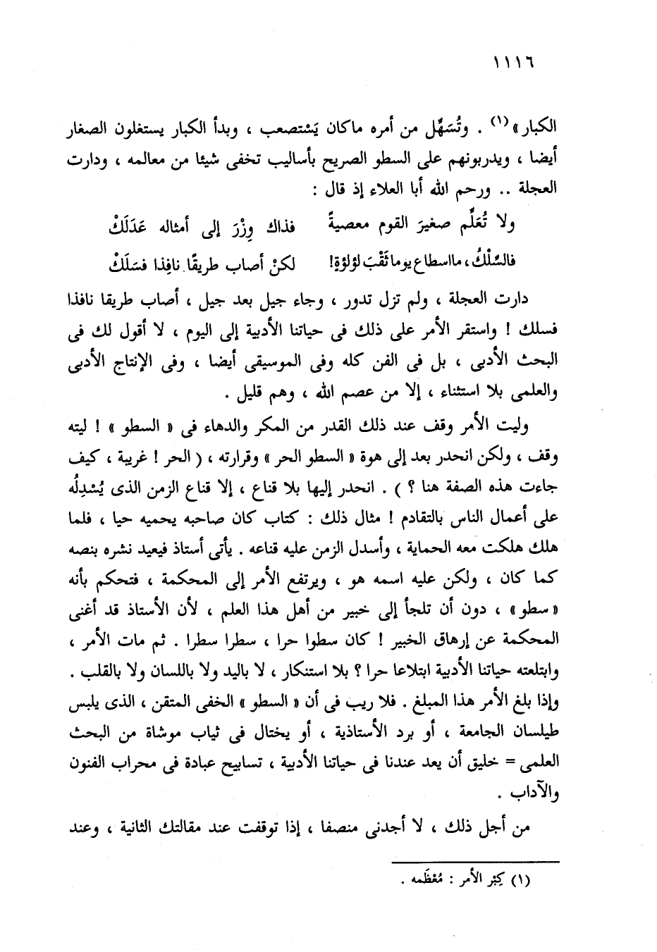 دارت العجلة، ولم تزل تدور، وجاء جيل بعد جيل، أصاب طريقا نافذا فسلك! واستقر الأمر على ذلك في حياتنا الأدبية إلى اليوم، لا أقول لك في البحث الأدبي، بل في الفن كله وفي الموسيقى أيضا، وفي الإنتاج الأدبي والعلمي بلا استثناء، إلا من عصم الله، وهم قليل.