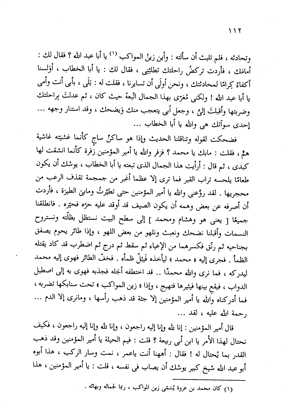 قال أمير المؤمنين: إنا لله وإنا إليه راجعون، وإنا لله وإنا إليه راجعون، فكيف نحتال لهذا الأمر يا ابن أبي ربيعة؟ قلت: فيم الحيلة يا أمير المؤمنين وقد ذهب القدر بما يُحتال له! فقال: أههنا أنت يا عمر، نمت وسار الركب، هذا أبوه أبو عبد الله شيخ كبير يوشك أن يصاب في نفسه، قلت: يا أمير المؤمنين، هذا
